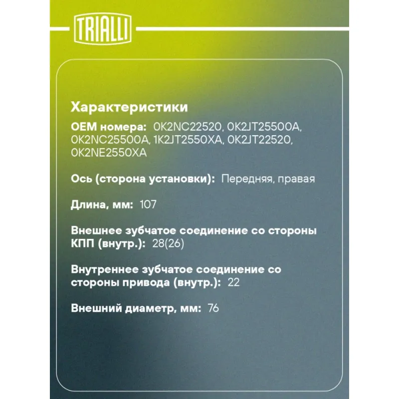 ШРУС внутренний правый для автомобилей Kia Spectra Ижевск 00-) 1.6i MT ECO Характеристики: Артикул: GO 0851 OEM номера: 0K2NC22520, 0K2JT25500A, 0K2NC25500A, 1K2JT2550XA, 0K2JT22520, 0K2NE2550XA Тип КПП: MT Материал пыльника: CR Товарная линейка: ECO Парный товар: GO 0852 Количество на автомобиль: 1 Ось (сторона установки): передняя, правая Длина, мм: 107 Внешнее зубчатое соединение со стороны КПП (внутр.): 28(26) Гарантийный срок: 2 года/60 000 км Внутреннее зубчатое соединение со стороны привода (внутр.): 22 Внешний диаметр, мм: 76 Сопутствующий товар: ШРУСы: GO 073122, GO 073243, GO 073142 Подходит для авто: Kia Shuma I (97-), Sephia II (97-), Spectra (00-) Для проверки применяемости отправьте VIN автомобиля через вкладку "Есть вопросы о товаре?" Комплектация: ШРУС - 1 шт Пыльник - 1 шт Стопорное кольцо - 1 шт Хомут - 2 шт Тюбик со смазкой - 1 шт Гарантийный талон - 1 шт Гарантия: от 1 года.