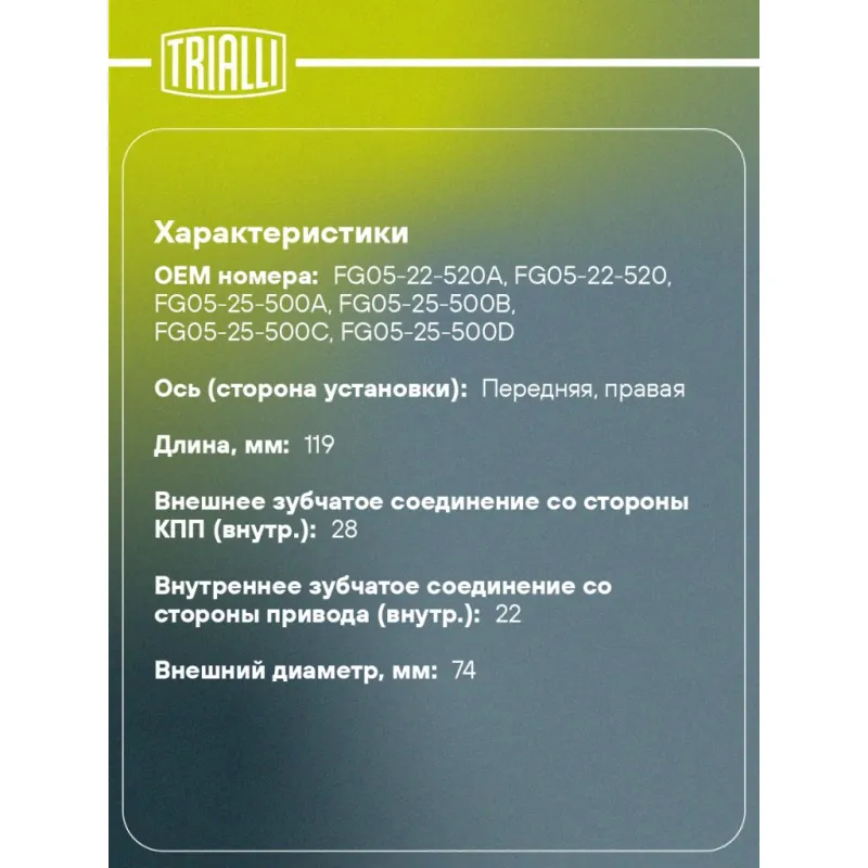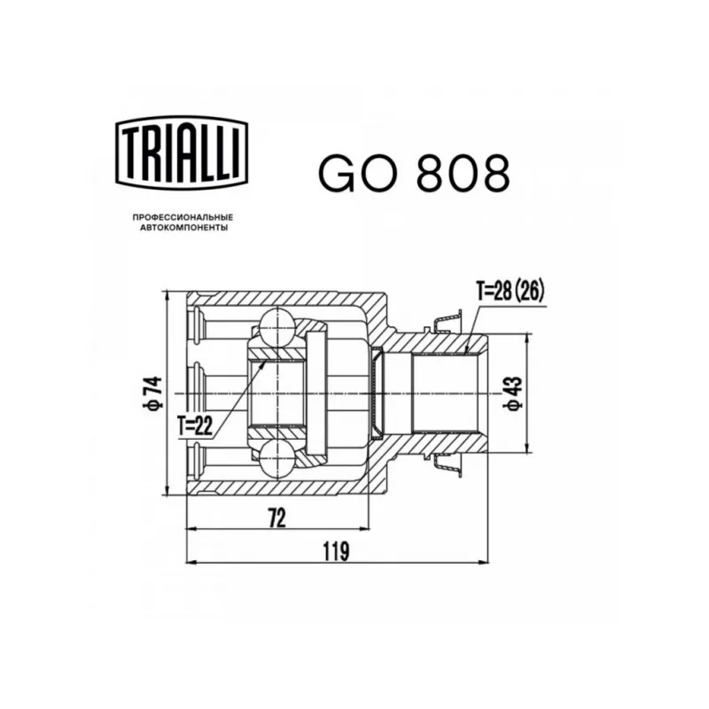 ШРУС внутренний правый для автомобилей Mazda 3 (03-) 2.0i MT Характеристики: Артикул: GO 808 OEM номера: FG05-22-520A, FG05-22-520, FG05-25-500A, FG05-25-500B, FG05-25-500C, FG05-25-500D Тип КПП: MT Материал пыльника: CR Количество на автомобиль: 1 Ось (сторона установки): передняя, правая Длина, мм: 119 Внешнее зубчатое соединение со стороны КПП (внутр.): 28 Гарантийный срок: 2 года/60 000 км Внутреннее зубчатое соединение со стороны привода (внутр.): 22 Внешний диаметр, мм: 74 Особенности конструкции:: шариковый Сопутствующий товар: Ремонтные комплекты ШРУСов: FG 0808 Сопутствующий товар: ШРУСы: GO 2522, GO 2524, GO 821 Товарная линейка: BLACK Комплектация: ШРУС - 1 шт Пыльник - 1 шт Хомут - 2 шт Стопорное кольцо - 1 шт Тюбик со смазкой - 1 шт Гарантийный талон - 1 шт Гарантия: от 1 года.