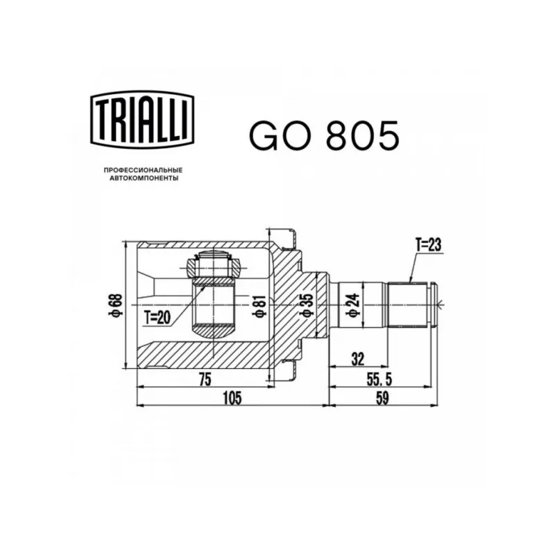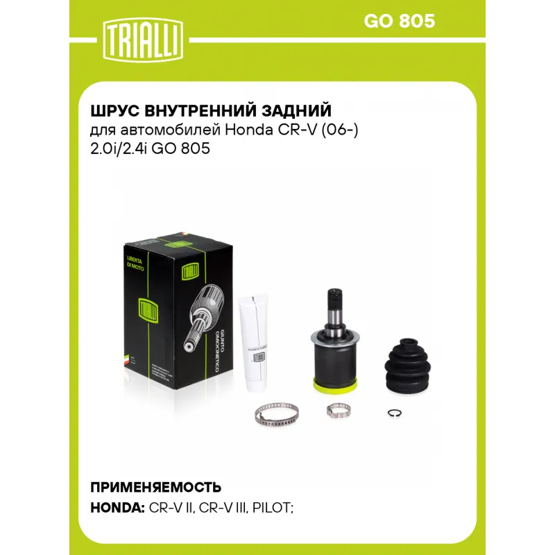 ШРУС внутренний задний для автомобилей Honda CR-V (06-) 2.0i/2.4i Характеристики: Артикул: GO 805 OEM номера: 42320-SXS-A11, 42320-SCA-E21 Тип КПП: MT/AT Материал пыльника: CR Количество на автомобиль: 2 Ось (сторона установки): задняя Длина, мм: 164 Внешнее зубчатое соединение со стороны КПП (внутр.): 23 Гарантийный срок: 2 года/60 000 км Внутреннее зубчатое соединение со стороны привода (внутр.): 20 Внешний диаметр, мм: 68 Сопутствующий товар: Приводы: AR 2304, AR 2320 Сопутствующий товар: Ремонтные комплекты ШРУСов: FG 2308, FG 2310 Сопутствующий товар: ШРУСы: GO 2317, GO 2312 Товарная линейка: BLACK Комплектация: ШРУС - 1 шт Пыльник - 1 шт Хомут - 2 шт Стопорное кольцо - 1 шт Тюбик со смазкой - 1 шт Гарантийный талон - 1 шт Гарантия: от 1 года.