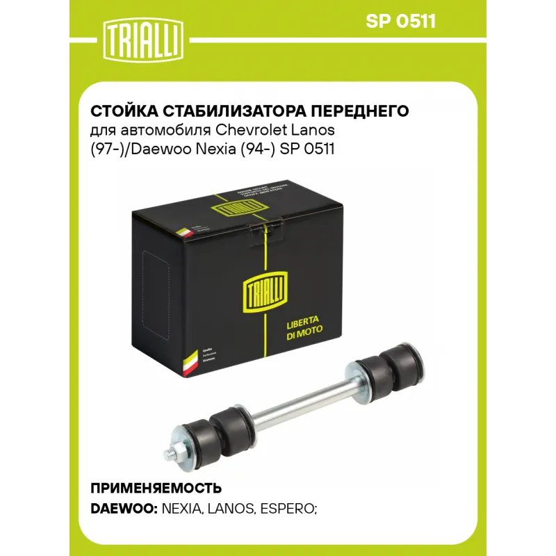 Стойка стабилизатора переднего для автомобиля Chevrolet Lanos (97-)/Daewoo Nexia (94-) Характеристики: Артикул: SP 0511 OEM номера: 90009367, 94500776, 16 03 148, 96129839, 02878013 Товарная линейка: BLACK Количество на автомобиль: 2 Материал: Резина/металл Гарантийный срок: 1 год/30 000 км Ось (сторона установки): Спереди, слева/справа Длина, мм: 205 Комплектация: Стойка стабилизатора - 1 шт Гарантия: от 1 года.