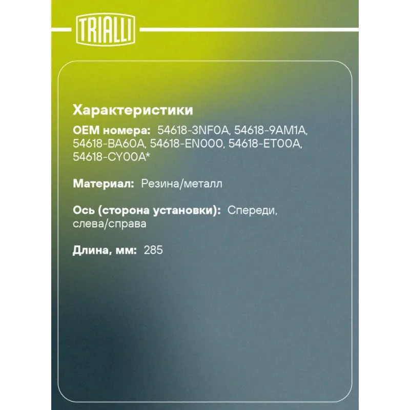 Стойка стабилизатора переднего для автомобиля Nissan Qashqai II (13-)/Juke (10-) Характеристики: Артикул: SP 1416 OEM номера: 54618-3NF0A, 54618-9AM1A, 54618-BA60A, 54618-EN000, 54618-ET00A, 54618-CY00A*, 54618-CY00A Товарная линейка: BLACK Количество на автомобиль: 2 Материал: Резина/металл Гарантийный срок: 1 год/30 000 км Ось (сторона установки): Спереди, слева/справа Длина, мм: 285 Подходит для авто: Nissan Qashqai II J11 (13-), Juke (10-), Juke (10-) Для проверки применяемости отправьте VIN автомобиля через вкладку "Есть вопросы о товаре?" Комплектация: Гайка - 2 шт Стойка стабилизатора - 1 шт Гарантия: от 1 года.