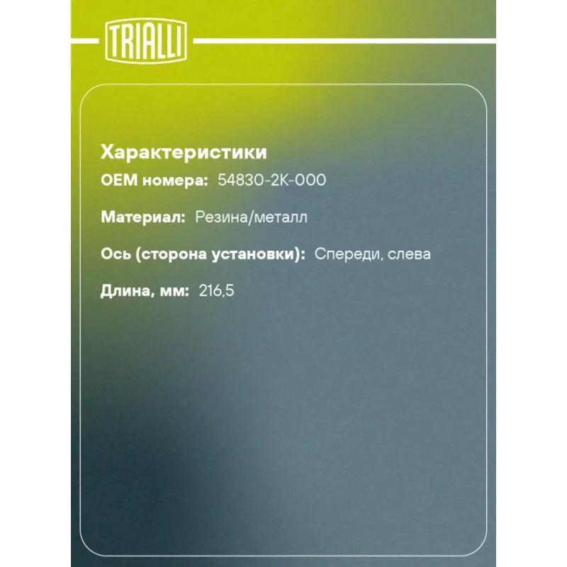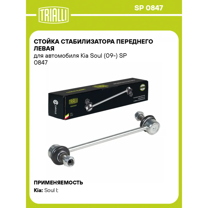 Стойка стабилизатора переднего левая для автомобиля Kia Soul (09-) Характеристики: Артикул: SP 0847 OEM номера: 54830-2K-000 Товарная линейка: BLACK Парный товар: SP 0848 Количество на автомобиль: 1 Материал: Резина/металл Гарантийный срок: 1 год/30 000 км Ось (сторона установки): Спереди, слева Длина, мм: 216,5 Подходит для авто: Kia Soul I (08-) Для проверки применяемости отправьте VIN автомобиля через вкладку "Есть вопросы о товаре?" Комплектация: Гайка - 2 шт Стойка стабилизатора - 1 шт Гарантия: от 1 года.