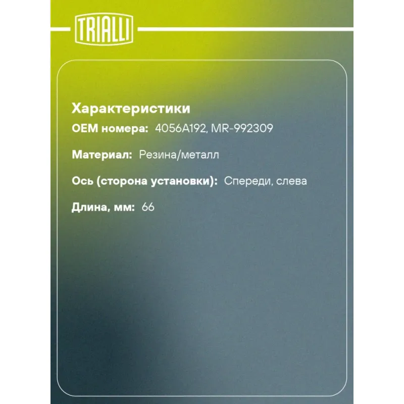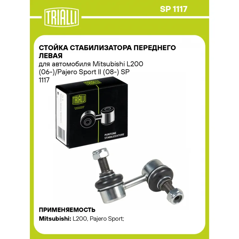 Стойка стабилизатора переднего левая для автомобиля Mitsubishi L200 (06-)/Pajero Sport II (08-) Характеристики: Артикул: SP 1117 OEM номера: 4056A192, MR-992309 Товарная линейка: BLACK Парный товар: SP 1118 Количество на автомобиль: 1 Материал: Резина/металл Гарантийный срок: 1 год/30 000 км Ось (сторона установки): Спереди, слева Длина, мм: 66 Подходит для авто: Mitsubishi L200 (06-), L200 (06-), Pajero Sport (08-) Для проверки применяемости отправьте VIN автомобиля через вкладку "Есть вопросы о товаре?" Комплектация: Стойка стабилизатора - 1 шт Гайка - 2 шт Гарантия: от 1 года.