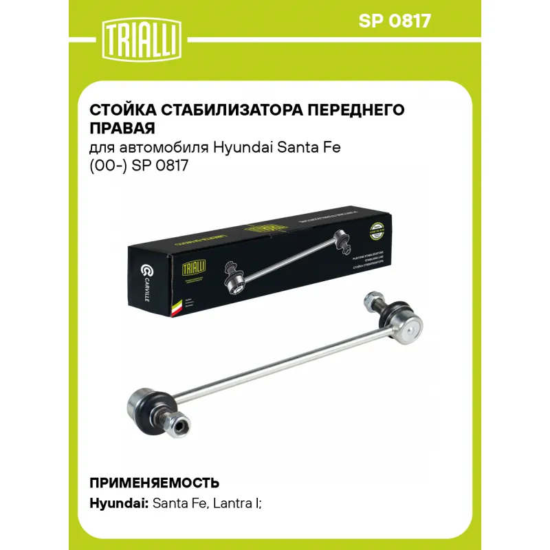Стойка стабилизатора переднего правая для автомобиля Hyundai Santa Fe (00-) Характеристики: Артикул: SP 0817 OEM номера: 54840-26000, 54840-26100 Товарная линейка: BLACK Парный товар: SP 0816 Количество на автомобиль: 1 Материал: Резина/металл Гарантийный срок: 1 год/30 000 км Ось (сторона установки): Спереди, справа Длина, мм: 264 Подходит для авто: Hyundai Santa Fe (00-), Lantra I (90-) Для проверки применяемости отправьте VIN автомобиля через вкладку "Есть вопросы о товаре?" Комплектация: Гайка - 2 шт Стойка стабилизатора - 1 шт Гарантия: от 1 года.