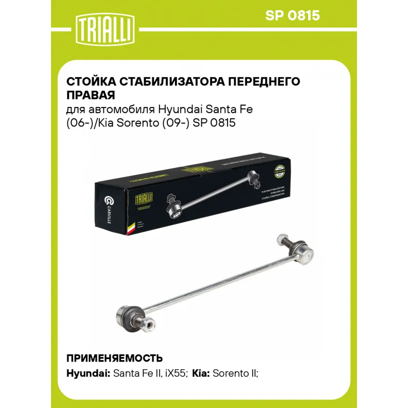 Стойка стабилизатора переднего правая для автомобиля Hyundai Santa Fe (06-)/Kia Sorento (09-) Характеристики: Артикул: SP 0815 OEM номера: 54840-2B000, 54840-2B200 Товарная линейка: BLACK Парный товар: SP 0814 Количество на автомобиль: 1 Материал: Резина/металл Гарантийный срок: 1 год/30 000 км Ось (сторона установки): Спереди, справа Длина, мм.: 340 Подходит для авто: Hyundai Santa Fe II (06-), Santa Fe II (06-), iX55 (09-) Kia Sorento II (09-) Для проверки применяемости отправьте VIN автомобиля через вкладку "Есть вопросы о товаре?" Комплектация: Гайка - 2 шт Стойка стабилизатора - 1 шт Гарантия: от 1 года.