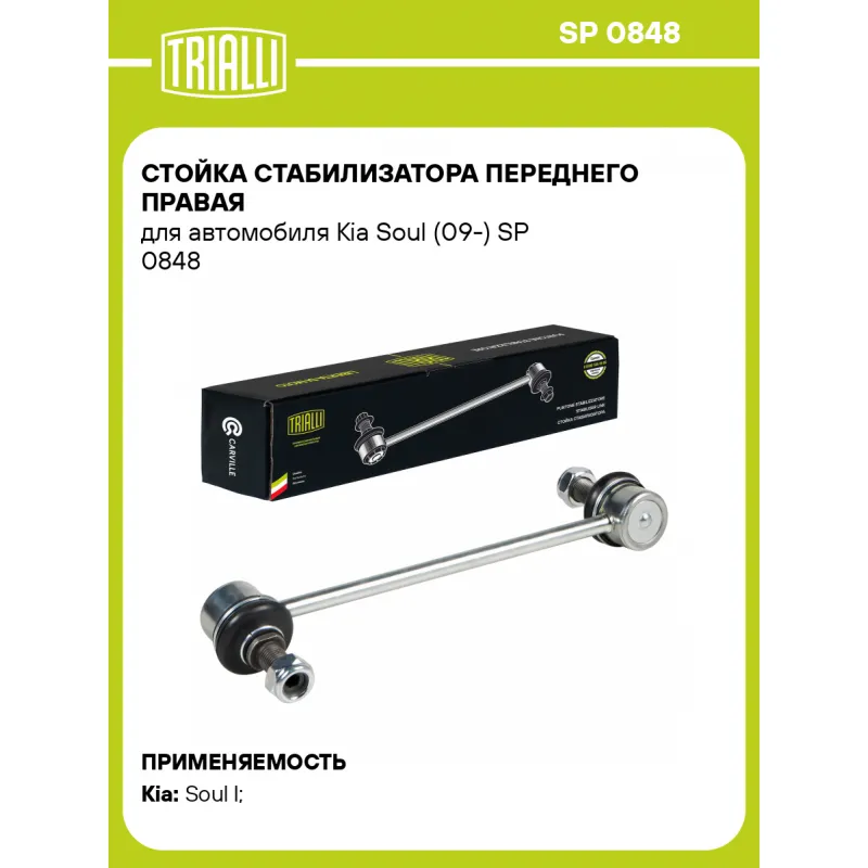 Стойка стабилизатора переднего правая для автомобиля Kia Soul (09-) Характеристики: Артикул: SP 0848 OEM номера: 54840-2K000 Товарная линейка: BLACK Парный товар: SP 0847 Количество на автомобиль: 1 Материал: Резина/металл Гарантийный срок: 1 год/30 000 км Ось (сторона установки): Спереди, справа Длина, мм: 216,5 Подходит для авто: Kia Soul I (08-) Для проверки применяемости отправьте VIN автомобиля через вкладку "Есть вопросы о товаре?" Комплектация: Стойка стабилизатора - 1 шт Гайка - 2 шт Гарантия: от 1 года.