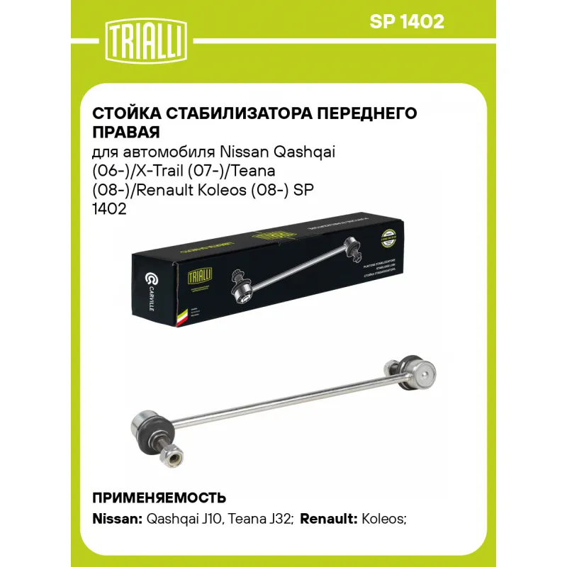 Стойка стабилизатора переднего правая для автомобиля Nissan Qashqai (06-)/X-Trail (07-)/Teana (08-)/Renault Koleos (08-) Характеристики: Артикул: SP 1402 OEM номера: 54618-4CB0A, 54618-1AA0A-, 54618-JD00A-, 54618-1AA0E-, 54 61 84C B0A Товарная линейка: BLACK Парный товар: SP 1401 Количество на автомобиль: 1 Материал: Резина/металл Гарантийный срок: 1 год/30 000 км Ось (сторона установки): Спереди, справа Длина, мм: 300 Подходит для авто: Nissan Qashqai J10 (06-), Teana J32 (08-), Qashqai J10 (06-), X-Trail T31 (07-), Teana J32 (08-) Renault Koleos (08-), Koleos (08-) Для проверки применяемости отправьте VIN автомобиля через вкладку "Есть вопросы о товаре?" Комплектация: Стойка стабилизатора - 1 шт Гайка - 2 шт Гарантия: от 1 года.