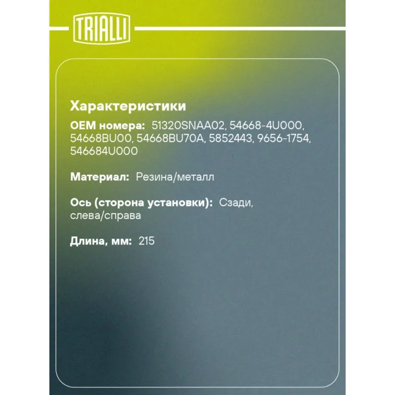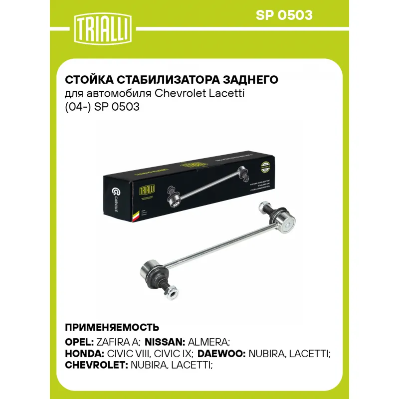 Стойка стабилизатора заднего для автомобиля Chevrolet Lacetti (04-) Характеристики: Артикул: SP 0503 OEM номера: 51320SNAA02, 54668-4U000, 54668BU00, 54668BU70A, 5852443, 9656-1754, 546684U000 Товарная линейка: BLACK Количество на автомобиль: 2 Материал: Резина/металл Гарантийный срок: 1 год/30 000 км Ось (сторона установки): Сзади, слева/справа Длина, мм: 215 Комплектация: Стойка стабилизатора - 1 шт Гайка - 2 шт Гарантия: от 1 года.