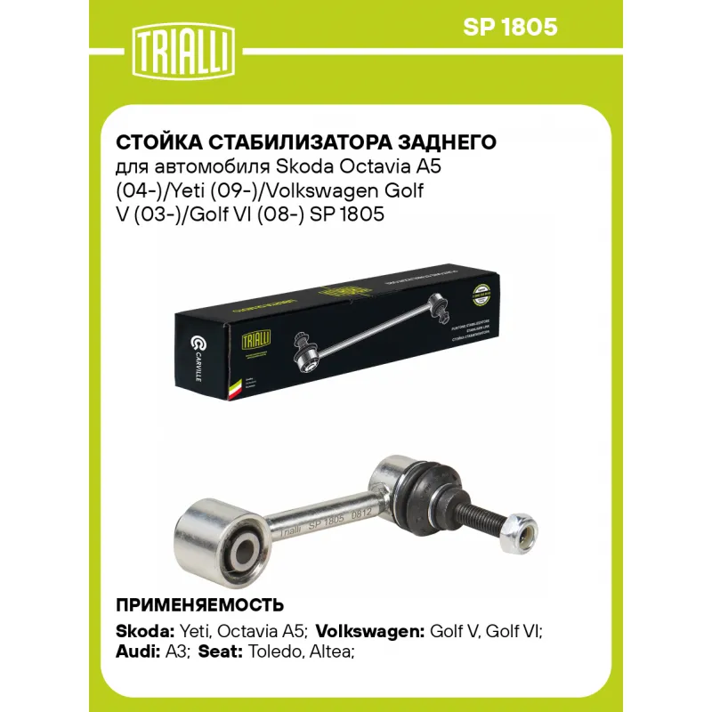 Стойка стабилизатора заднего для автомобиля Skoda Octavia A5 (04-)/Yeti (09-)/Volkswagen Golf V (03-)/Golf VI (08-) Характеристики: Артикул: SP 1805 OEM номера: 1K0.505.465J, 1K0.505.465H, 1K0.505.465D, 1KD 505 465, 1KD 505 465 A, 1K0 505 465 R, 1K0 505 465 L, 1K0 505 465 J, 1K0 505 465 H, 1K0 505 465 D, 1K0 505 465 AA, 1K0.505.465K, 1K0.505.465C Товарная линейка: BLACK Количество на автомобиль: 2 Материал: Резина/металл Гарантийный срок: 1 год/30 000 км Ось (сторона установки): Сзади, слева/справа Длина, мм: 94 Подходит для авто: Skoda Yeti (09-), Octavia A5 (04-), Yeti (09-) Volkswagen Golf V (03-), Golf VI (08-) Audi A3 (03-) Seat Toledo (04-), Toledo (04-), Altea (04-) Для проверки применяемости отправьте VIN автомобиля через вкладку "Есть вопросы о товаре?" Комплектация: Гайка - 2 шт Стойка стабилизатора - 1 шт Гарантия: от 1 года.