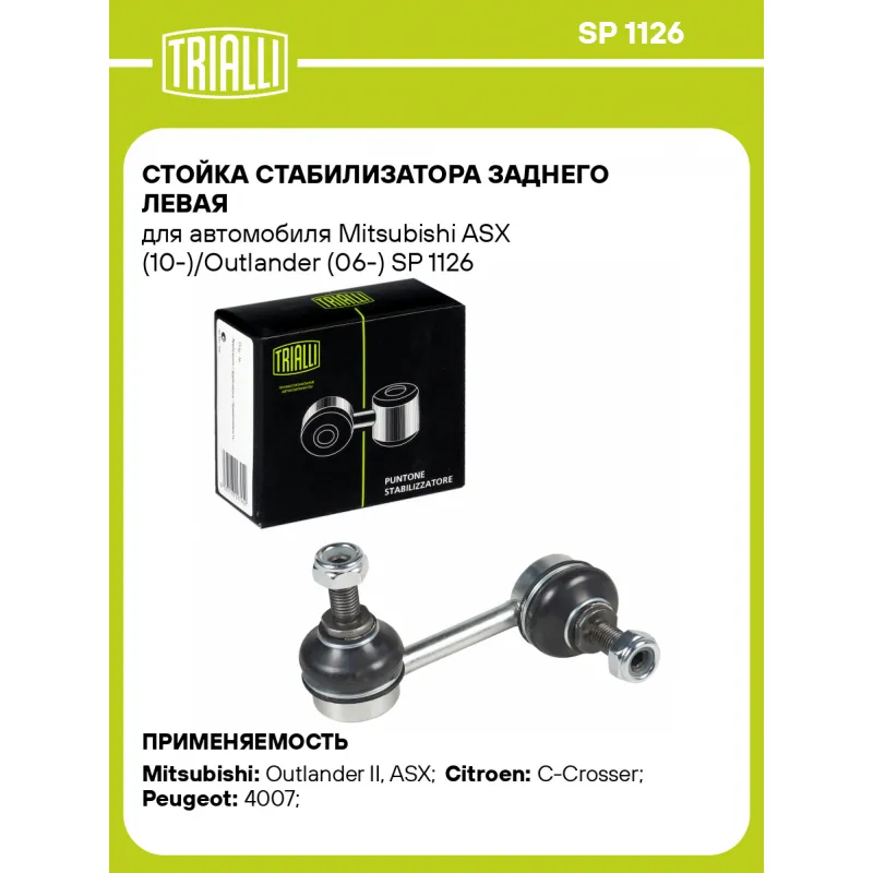Стойка стабилизатора заднего левая для автомобиля Mitsubishi ASX (10-)/Outlander (06-) Характеристики: Артикул: SP 1126 OEM номера: 4156A014, 5178.48 Товарная линейка: BLACK Парный товар: SP 1127 Количество на автомобиль: 1 Материал: Резина/металл Гарантийный срок: 1 год/30 000 км Ось (сторона установки): Сзади, слева Длина, мм: 80 Подходит для авто: Mitsubishi Outlander II (06-), ASX (10-) Citroen C-Crosser (07-), C-Crosser (07-) Peugeot 4007 (07-) Для проверки применяемости отправьте VIN автомобиля через вкладку "Есть вопросы о товаре?" Комплектация: Стойка стабилизатора - 1 шт Гайка - 2 шт Гарантия: от 1 года.
