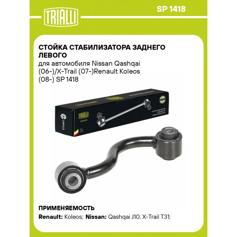 Стойка стабилизатора заднего левого для автомобиля Nissan Qashqai (06-)/X-Trail (07-)Renault Koleos (08-) Характеристики: Артикул: SP 1418 OEM номера: 55619 JD00A*, 55619-JD00A-, 55619-JY00B- Товарная линейка: BLACK Парный товар: SP 1419 Количество на автомобиль: 1 Материал: Резина/металл Гарантийный срок: 1 год/30 000 км Ось (сторона установки): Сзади, слева Длина, мм: 143,5 Подходит для авто: Renault Koleos (08-), Koleos (08-) Nissan Qashqai J10 (06-), X-Trail T31 (07-), Qashqai J10 (06-) Для проверки применяемости отправьте VIN автомобиля через вкладку "Есть вопросы о товаре?" Комплектация: Стойка стабилизатора - 1 шт Гарантия: от 1 года.