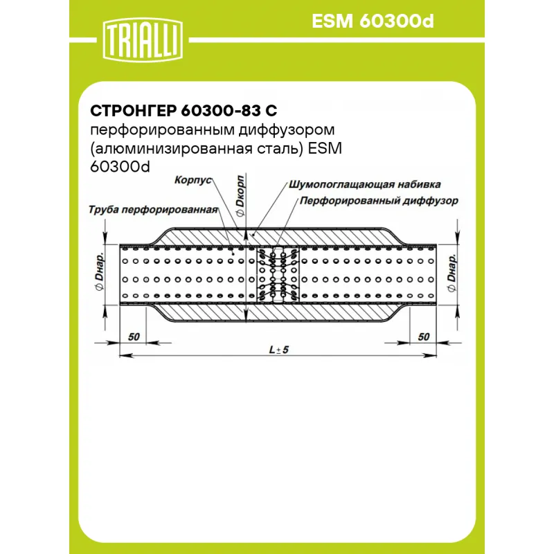Стронгер 60300-83 с перфорированным диффузором (алюминизированная сталь) Характеристики: Артикул: ESM 60300d OEM номера: 286102E150, 28950337630, 286502E170, 287001F120, 285102BPF2, 286102Y500, 286502Y500, 287003U500, 286102S100, 289602G900, 286502S100, 287002Y100, 286102S300, 286502S300, 287002Y300, 28610-2E100, 2895037630, 286502E151, 28700-2E151, 286502E651, 287002E350, 289902F000, 14002JD90A, 20010JD200, 20100BR20A, 20010JD000, 20100JD00A, 1741037320, 1742037040, 1743037371, 2505126020, 1741026400, 1743026743, 2505126080, 1714137100, 1714037321, 1742037120, 1743037521, 2505126130, 1741026470, 2505128340, 1741028582, 1742028712, 1743037372, 20010JD20B, 208A0JG10B, 20010BR40A, 20100JD71B, 1583A028, 1570A842, 1570B175, 1571A703, 1741028551, 1742028470, 1743028720, 28610-C9200, 28610-M0200, 28610-M0250, 28710-M0200, 28710-M0250, 17410-0V390, 17420-0V340, 17430-0V340, 20010JG02A, 20100JG05A, 208A0JD50A, 20100JG70A, 18190r07e00, 18210-SWY-E11, 18160-R07-E00, 18220-SWY-E01, 18307-SWY-E01, 2851023820, 28610-2E100, 28950-23756, 28650-2E120, 28700-2E120, 28650-2E150, 28700-2E151, 17410-0H450, 17420-36120, 17430-36170, 1570A94, 1570A094, 1570A837, 1571A622, 140029Y920, 200108H70A, 200188H70A, 203008H31A, 201008H70A, 1742028320, 1743028510, 1K0254510X, 1K0253209BJ, 1Z3253609AE, 1K0253209CS, 1K5253609E, 1Z0253609AE, 18160RZPG00, 18210SWWE01, 18210-S10A01, 18160-P3FG10, 18160PHKG00, 18220-S10A03, 18030-S10A00, MN180083, MN156565, MN180617, 1570B398, 1571B053, 893253409B, 96345722, 13252425, A131201210FA, T111201110, 1234018, 1253560, 1329718, 1677751, 1364172, 30681701, 1329731, 1201210F00B1, 1201010F00, 1571B134, 6RU253609, 6RU253611B, 6RU253609S, 6RU253609T , 6RU253611E, 4A0253609A, 57253409C Количество на автомобиль: 1 Длина, мм: 300 Особенности конструкции:: Перфорированный диффузор и шумопоглощающий материал Диаметр корпуса, мм: 83 Диаметр трубы (мм): 60 Материал: Алюминизированная сталь Гарантийный срок: 2 года/60 тыс. Товарная линейка: BLACK Дополнительная информация: Этикетка изделия может отличаться от представленной на фото Диаметр перфор. трубы (мм): 63.5 Комплектация: Стронгер (пламегаситель) - 1 шт Гарантия: от 1 года.