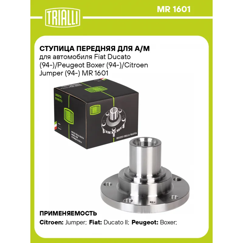Ступица передняя для а/м для автомобиля Fiat Ducato (94-)/Peugeot Boxer (94-)/Citroen Jumper (94-) Характеристики: Артикул: MR 1601 OEM номера: 3307.77, 3307.84, 1346653080, 1328045080 Товарная линейка: BLACK Количество на автомобиль: 2 Сторона установки: Спереди, слева/справа Высота, мм: 101 Внутренний диаметр, мм: 49 Внешний диаметр, мм: 139 Особенности конструкции:: Без подшипника Количество зубьев: 28 Гарантийный срок: 2 года/60 000 км Крепление колёсного диска: M14x1,5 Разболтовка (PCD):: 5x118 Разболтовка (PCD): 5-M14x1.5-118 Подходит для авто: Citroen Jumper (94-), Jumper (94-) Fiat Ducato II (94-), Ducato II (94-) Peugeot Boxer (94-) Для проверки применяемости отправьте VIN автомобиля через вкладку "Есть вопросы о товаре?" Комплектация: Ступица - 1 шт Гарантия: от 1 года.