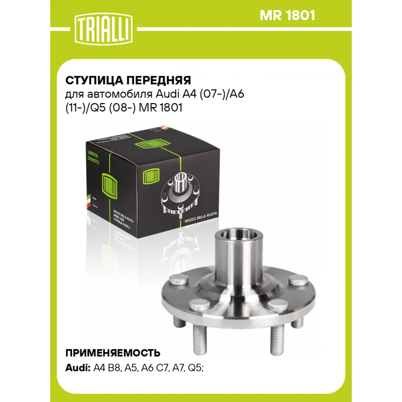 Ступица передняя для автомобиля Audi A4 (07-)/A6 (11-)/Q5 (08-) Характеристики: Артикул: MR 1801 OEM номера: 8K0 407 613 B, 8K0 407 615 B, 8K0 407 607 A Товарная линейка: BLACK Количество на автомобиль: 2 Подходящий болт колесный AIRLINE:: ABLT001 Сторона установки: Спереди, слева/справа Высота, мм: 71,6 Внутренний диаметр, мм: 61 Внешний диаметр, мм: 142 Особенности конструкции:: Без подшипника Количество зубьев: 42 Сопутствующие товары: Ремонтные комплекты ступицы: MR 1832 Гарантийный срок: 2 года/60 000 км Крепление колёсного диска: M14x1,5 Разболтовка (PCD):: 5x112 Сопутствующие товары:: MR 1832 Разболтовка (PCD): 5-M14x1.5-112 Подходит для авто: Audi A4 B8 (07-), A4 B8 (07-), A5 (07-), A5 (07-), A5 (07-), A6 C7 (11-), A7 (10-), Q5 (08-), A6 C7 (11-), A7 (10-), Q5 (08-) Для проверки применяемости отправьте VIN автомобиля через вкладку "Есть вопросы о товаре?" Комплектация: Ступица - 1 шт Гарантия: от 1 года.