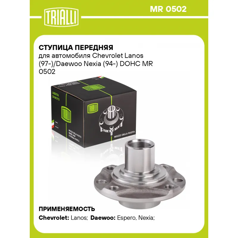 Ступица передняя для автомобиля Chevrolet Lanos (97-)/Daewoo Nexia (94-) DOHC Характеристики: Артикул: MR 0502 OEM номера: 96162249 Товарная линейка: BLACK Количество на автомобиль: 2 Сторона установки: Спереди, слева/справа Высота, мм: 81 Внутренний диаметр, мм: 33 Внешний диаметр, мм: 120 Особенности конструкции:: Без подшипника Количество зубьев: 33 Сопутствующие товары: Ремонтные комплекты ступицы: CS 0577 Гарантийный срок: 2 года/60 000 км Крепление колёсного диска: M12x1,5 Разболтовка (PCD):: 4x100 Число зубцов, шт.: 33 Сопутствующие товары:: CS 0577 Разболтовка (PCD): 4-M12x1.5-100 Подходит для авто: Chevrolet Lanos (05-), Lanos (97-) Daewoo Espero (90-), Nexia (94-), Espero (90-), Nexia (94-) Для проверки применяемости отправьте VIN автомобиля через вкладку "Есть вопросы о товаре?" Комплектация: Ступица - 1 шт Гарантия: от 1 года.