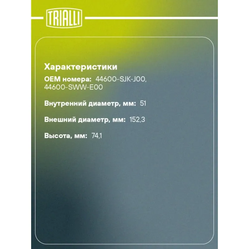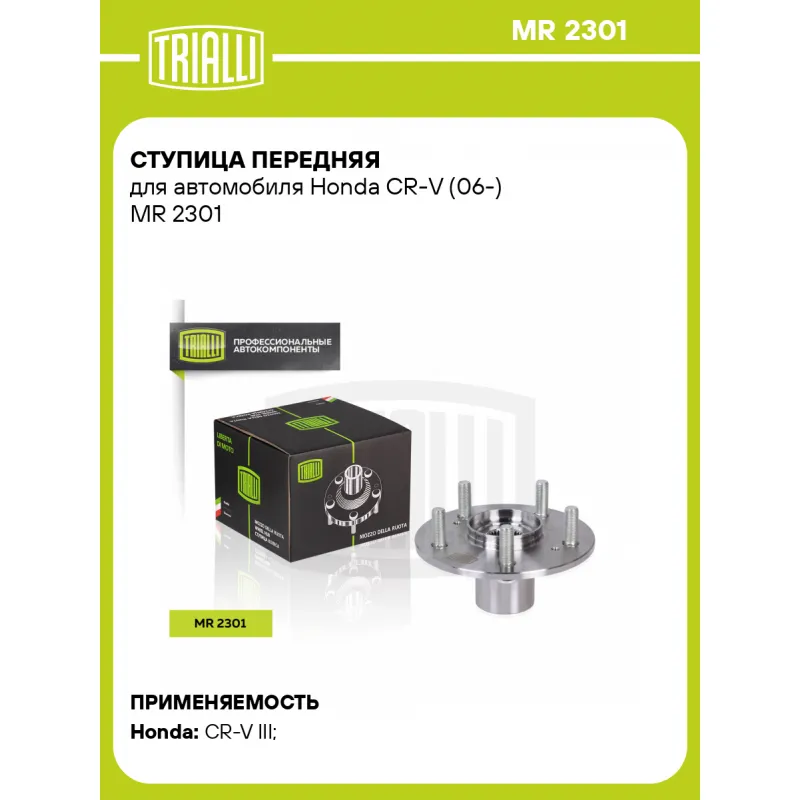 Ступица передняя для автомобиля Honda CR-V (06-) Характеристики: Артикул: MR 2301 OEM номера: 44600-SJK-J00, 44600-SWW-E00 Товарная линейка: BLACK Количество на автомобиль: 2 Подходящая гайка колесная AIRLINE:: ASCR019, ASCR021 Подходящая шпилька колесная AIRLINE:: ASTD007 Сторона установки: Спереди, слева/справа Высота, мм: 74,1 Внутренний диаметр, мм: 51 Внешний диаметр, мм: 152,3 Особенности конструкции:: Без подшипника Количество зубьев: 30 Гарантийный срок: 2 года/60 000 км Крепление колёсного диска: M12x1,5 Разболтовка (PCD):: 5x114,3 Разболтовка (PCD): 5-M12x1.5-114.3 Подходит для авто: Honda CR-V III (06-), CR-V III (06-) Для проверки применяемости отправьте VIN автомобиля через вкладку "Есть вопросы о товаре?" Комплектация: Ступица - 1 шт Гарантия: от 1 года.