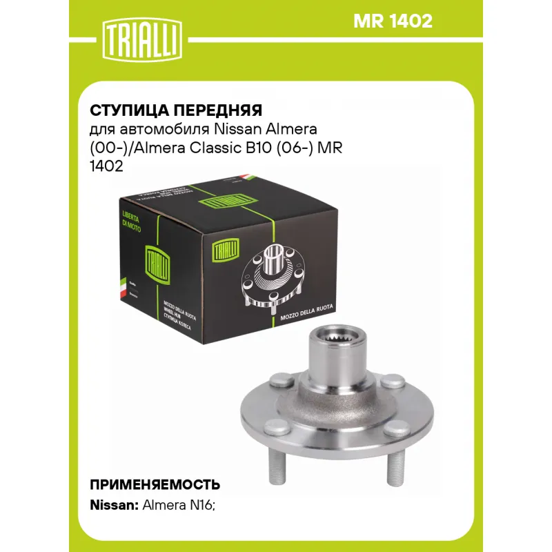 Ступица передняя для автомобиля Nissan Almera (00-)/Almera Classic B10 (06-) Характеристики: Артикул: MR 1402 OEM номера: 40202-4M400, 40202-4M405 Товарная линейка: BLACK Количество на автомобиль: 2 Подходящая гайка колесная AIRLINE:: ASCR008, ASCR018, ASCR027 Подходящая шпилька колесная AIRLINE:: ASTD003 Сторона установки: Спереди, слева/справа Высота, мм: 80,5 Внутренний диаметр, мм: 40 Внешний диаметр, мм: 136 Особенности конструкции:: Без подшипника Количество зубьев: 25 Сопутствующие товары: Ремонтные комплекты ступицы: CS 1470 Гарантийный срок: 2 года/60 000 км Крепление колёсного диска: M12x1,25 Разболтовка (PCD):: 4x114,3 Сопутствующие товары:: CS 1470 Разболтовка (PCD): 4-M12x1.25-114.3 Подходит для авто: Nissan Almera N16 (00-), Almera N16 (00-) Для проверки применяемости отправьте VIN автомобиля через вкладку "Есть вопросы о товаре?" Комплектация: Ступица - 1 шт Гарантия: от 1 года.