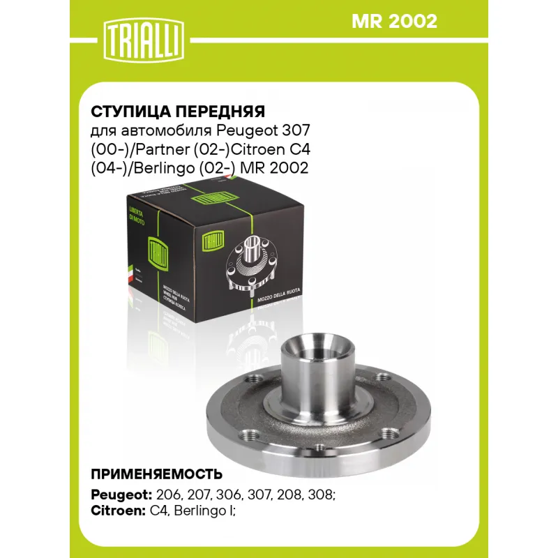 Ступица передняя для автомобиля Peugeot 307 (00-)/Partner (02-)Citroen C4 (04-)/Berlingo (02-) Характеристики: Артикул: MR 2002 OEM номера: 3307.56, 3307.69, 3307.71, 3307.72, 3307.85 Товарная линейка: BLACK Количество на автомобиль: 2 Подходящий болт колесный AIRLINE:: ABLT007, ABLT029 Сторона установки: Спереди, слева/справа Высота, мм: 66 Внутренний диаметр, мм: 42 Внешний диаметр, мм: 129 Особенности конструкции:: Без подшипника Количество зубьев: 25 Дополнительная информация: Для а/м после 11.04 г.в. Сопутствующие товары: Ремонтные комплекты ступицы: CS 2070 Гарантийный срок: 2 года/60 000 км Крепление колёсного диска: M12x1,25 Разболтовка (PCD):: 4x108 Сопутствующие товары:: CS 2070 Разболтовка (PCD): 4-M12x1.25-108 Подходит для авто: Peugeot 206 (98-), 206 (98-), 207 (06-), 306 (97-), 306 (97-), 307 (00-), 208 (12-), 308 (13-), Partner (96-), 207 (06-), 208 (12-), 308 (13-) Citroen C4 (04-), C4 (04-), Berlingo I (96-) Для проверки применяемости отправьте VIN автомобиля через вкладку "Есть вопросы о товаре?" Комплектация: Ступица - 1 шт Гарантия: от 1 года.