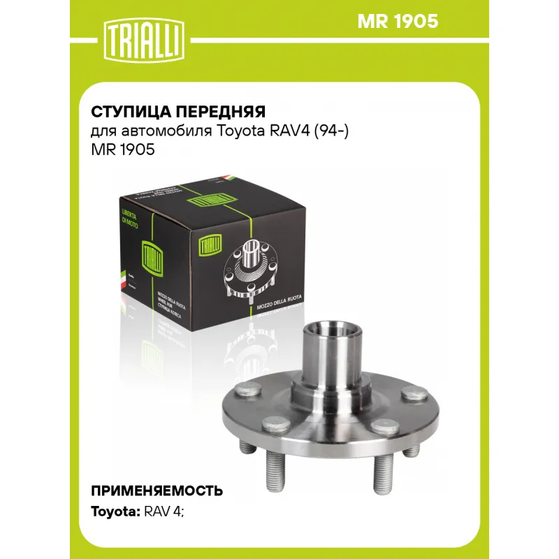 Ступица передняя для автомобиля Toyota RAV4 (94-) Характеристики: Артикул: MR 1905 OEM номера: 43502-42010 Товарная линейка: BLACK Количество на автомобиль: 2 Подходящая гайка колесная AIRLINE:: ASCR001, ASCR002, ASCR004, ASCR005, ASCR009 Подходящая шпилька колесная AIRLINE:: ASTD002, ASTD006, ASTD008 Сторона установки: Спереди, слева/справа Высота, мм: 75 Внутренний диаметр, мм: 38 Внешний диаметр, мм: 140 Особенности конструкции:: Без подшипника Количество зубьев: 26 Сопутствующие товары: Ремонтные комплекты ступицы: CS 1993 Гарантийный срок: 2 года/60 000 км Крепление колёсного диска: M12x1,5 Разболтовка (PCD):: 5x114,3 Сопутствующие товары:: CS 1993 Разболтовка (PCD): 5-M12x1.5-114.3 Подходит для авто: Toyota RAV 4 (00-), RAV 4 (00-) Для проверки применяемости отправьте VIN автомобиля через вкладку "Есть вопросы о товаре?" Комплектация: Ступица - 1 шт Гарантия: от 1 года.
