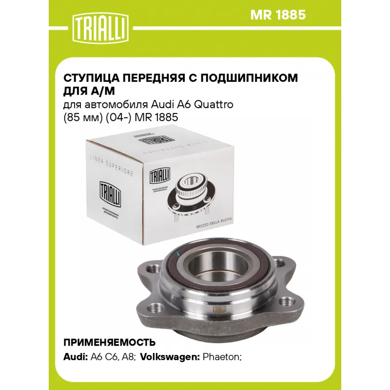 Ступица передняя с подшипником для а/м для автомобиля Audi A6 Quattro (85 мм) (04-) Характеристики: Артикул: MR 1885 OEM номера: 4E0 407 625 E, 4F0 498 625, 4F0 498 625B Товарная линейка: BLACK Крепление колёсного диска: M12x1,5 Количество на автомобиль: 2 Сторона установки: Спереди, слева/справа Высота, мм: 40,3 Внутренний диаметр, мм: 43 Внешний диаметр, мм: 85 Особенности конструкции:: С подшипником Количество креп. отверстий: 4 Гарантийный срок: 1 год/30 000 км Подходит для авто: Audi A6 C6 (04-), A8 (94-), A8 (94-) Volkswagen Phaeton (02-), Phaeton (02-) Для проверки применяемости отправьте VIN автомобиля через вкладку "Есть вопросы о товаре?" Комплектация: Ступица - 1 шт Гарантия: от 1 года.