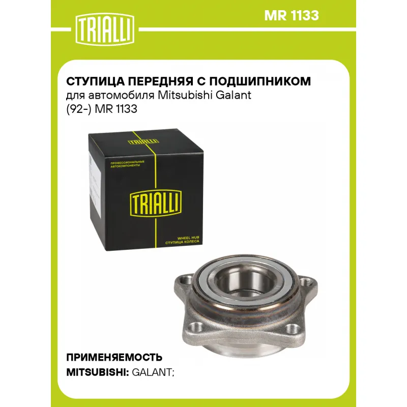 Ступица передняя с подшипником для автомобиля Mitsubishi Galant (92-) Характеристики: Артикул: MR 1133 OEM номера: MB631512, MB631514, MB664847, MB864847, MB949096, MB949097, MR455004, MR475333, MR491037, MR103664, MR334386, MR369519, MR403969, MR403970, MR455003 Гарантийный срок: 1 года/30 000 км Товарная линейка: BLACK Количество на автомобиль: 2 Сторона установки: Спереди, слева/справа Внешний диаметр, мм: 84 Особенности конструкции:: С подшипником Количество креп. отверстий: 4 Комплектация: Ступица - 1 шт Гарантия: от 1 года.