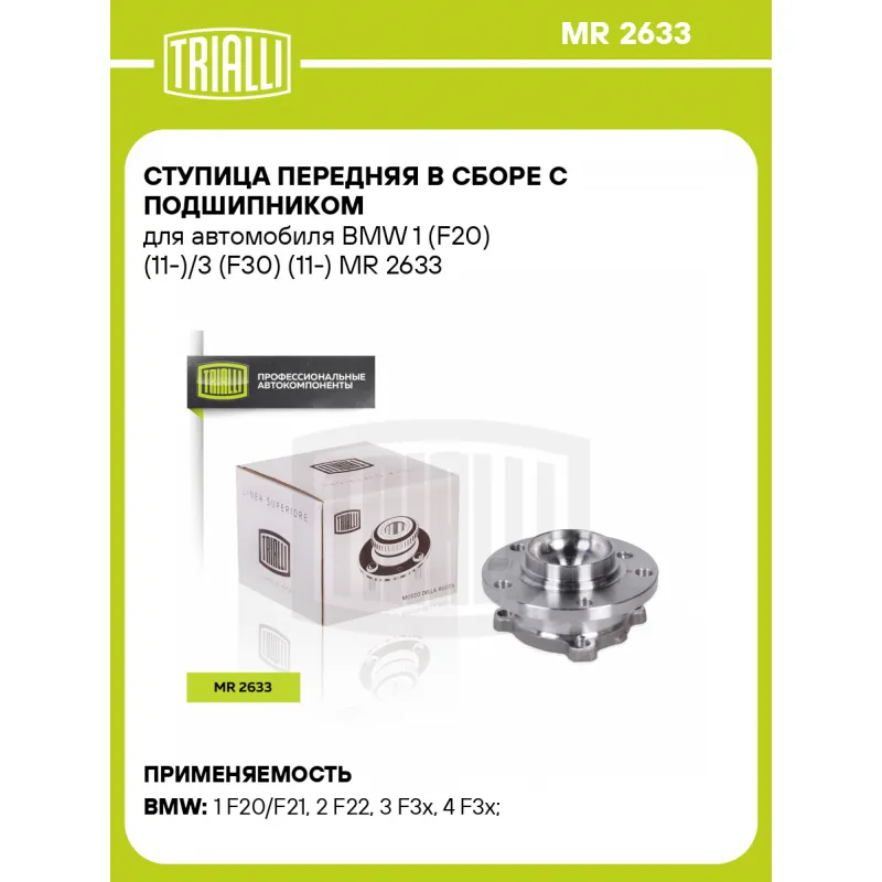 Ступица передняя в сборе с подшипником для автомобиля BMW 1 (F20) (11-)/3 (F30) (11-) Характеристики: Артикул: MR 2633 OEM номера: 31 20 6 857 230, 31 20 6 867 256 Товарная линейка: BLACK Количество на автомобиль: 2 Подходящий болт колесный AIRLINE:: ABLT006 Сторона установки: Спереди, слева/справа Высота, мм: 84,3 Внешний диаметр, мм: 143 Особенности конструкции:: С подшипником Количество креп. отверстий: 4 Гарантийный срок: 1 год/30 000 км Крепление колёсного диска: M14x1,25 Разболтовка (PCD):: 5x120 Разболтовка (PCD): 5-M14x1.25-120 Подходит для авто: BMW 1 F20/F21 (11-), 2 F22 (13-), 1 F20/F21 (11-), 1 F20/F21 (11-), 3 F3x (11-), 4 F3x (13-) Для проверки применяемости отправьте VIN автомобиля через вкладку "Есть вопросы о товаре?" Комплектация: Ступица - 1 шт Гарантия: от 1 года.
