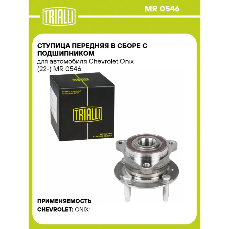 Ступица передняя в сборе с подшипником для автомобиля Chevrolet Onix (22-) Характеристики: Артикул: MR 0546 OEM номера: 26698388 Количество зубьев: 33 Особенности конструкции:: С подшипником Количество креп. отверстий: 3 Внешний диаметр, мм: 56,5 Внутренний диаметр, мм: 49 Гарантийный срок: 1 года/30 000 км Сторона установки: Спереди, слева/справа Разболтовка (PCD):: 4x100 Товарная линейка: BLACK Крепление колёсного диска: M12x1,5 Количество на автомобиль: 2 Комплектация: Ступица - 1 шт Гарантия: от 1 года.