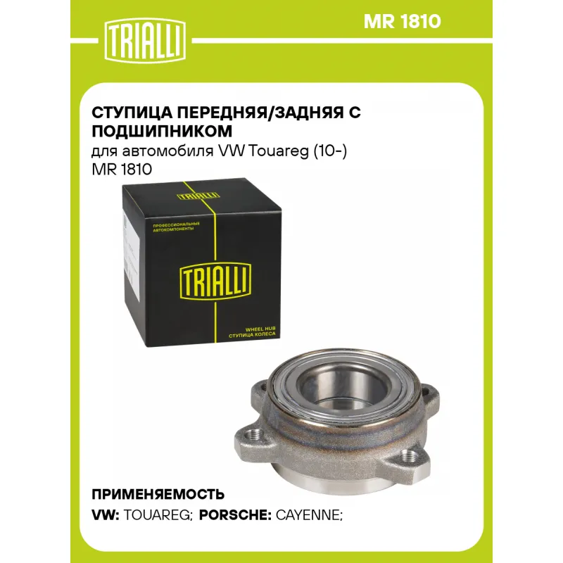 Ступица передняя/задняя с подшипником для автомобиля VW Touareg (10-) Характеристики: Артикул: MR 1810 OEM номера: 958 331 583 00, 958 341 901 00, 7P0 498 287 Гарантийный срок: 1 года/30 000 км Товарная линейка: BLACK Крепление колёсного диска: M12x1,25 Количество на автомобиль: 4 Сторона установки: Спереди, сзади, слева/справа Внешний диаметр, мм: 95 Особенности конструкции:: С подшипником Количество креп. отверстий: 4 Комплектация: Ступица - 1 шт Гарантия: от 1 года.