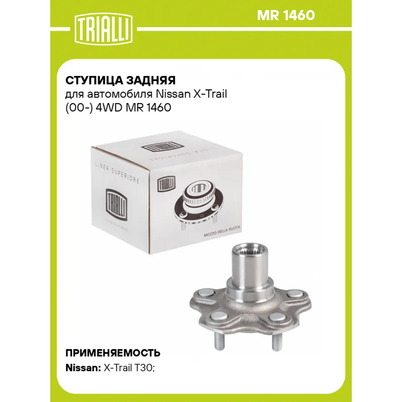 Ступица задняя для автомобиля Nissan X-Trail (00-) 4WD Характеристики: Артикул: MR 1460 OEM номера: 43202-AG000, 43210-AL510, 43210-AL505, 3925235F03, 43210AL500, 43210AL505 Товарная линейка: BLACK Количество на автомобиль: 2 Подходящая гайка колесная AIRLINE:: ASCR008, ASCR018, ASCR027 Подходящая шпилька колесная AIRLINE:: ASTD003 Сторона установки: Сзади, слева/справа Высота, мм: 94 Внутренний диаметр, мм: 42,8 Внешний диаметр, мм: 147 Особенности конструкции:: Без подшипника Количество зубьев: 29 Сопутствующие товары: Ремонтные комплекты ступицы: CS 1477 Гарантийный срок: 2 года/60 000 км Крепление колёсного диска: M12x1,25 Разболтовка (PCD):: 5x114,3 Сопутствующие товары:: CS 1477 Разболтовка (PCD): 5-M12x1.25-114.3 Подходит для авто: Nissan X-Trail T30 (01-), X-Trail T30 (01-) Для проверки применяемости отправьте VIN автомобиля через вкладку "Есть вопросы о товаре?" Комплектация: Ступица - 1 шт Гарантия: от 1 года.