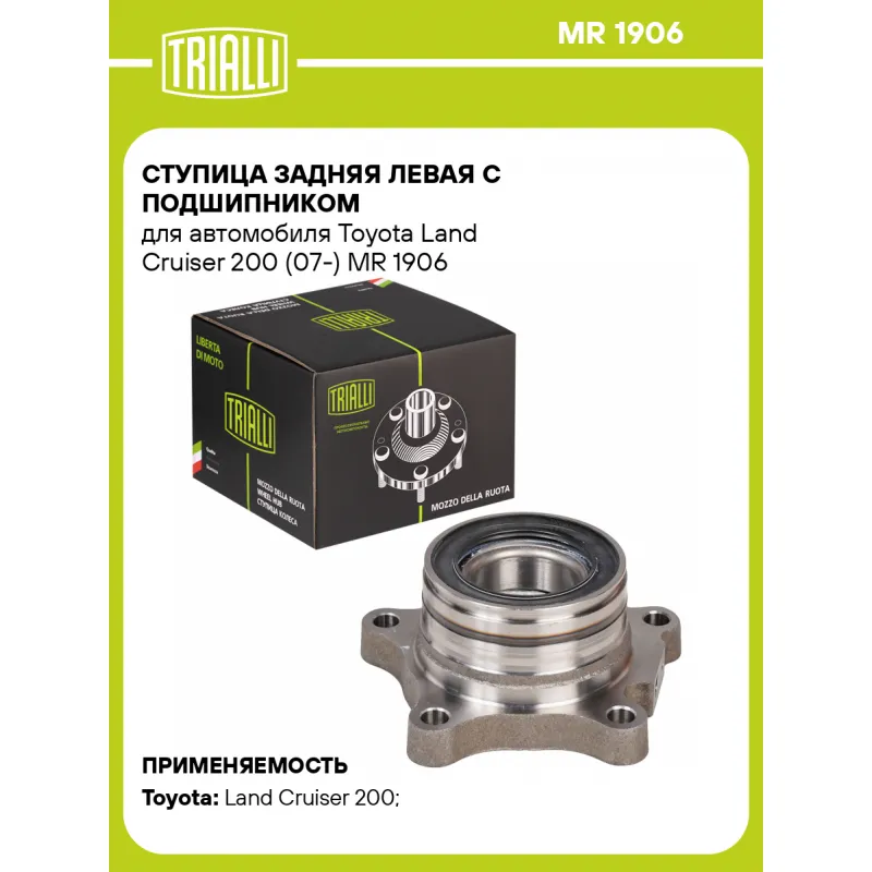 Ступица задняя левая с подшипником для автомобиля Toyota Land Cruiser 200 (07-) Характеристики: Артикул: MR 1906 OEM номера: 42460-60030 Товарная линейка: BLACK Парный товар: MR 1907 Количество на автомобиль: 1 Сторона установки: сзади, слева Высота, мм: 67 Внутренний диаметр, мм: 49 Внешний диаметр, мм: 94,5 Особенности конструкции:: С подшипником Количество креп. отверстий: 4 Гарантийный срок: 1 год/30 000 км Подходит для авто: Toyota Land Cruiser 200 (07-), Land Cruiser 200 (15-) Для проверки применяемости отправьте VIN автомобиля через вкладку "Есть вопросы о товаре?" Комплектация: Ступица - 1 шт Гарантия: от 1 года.