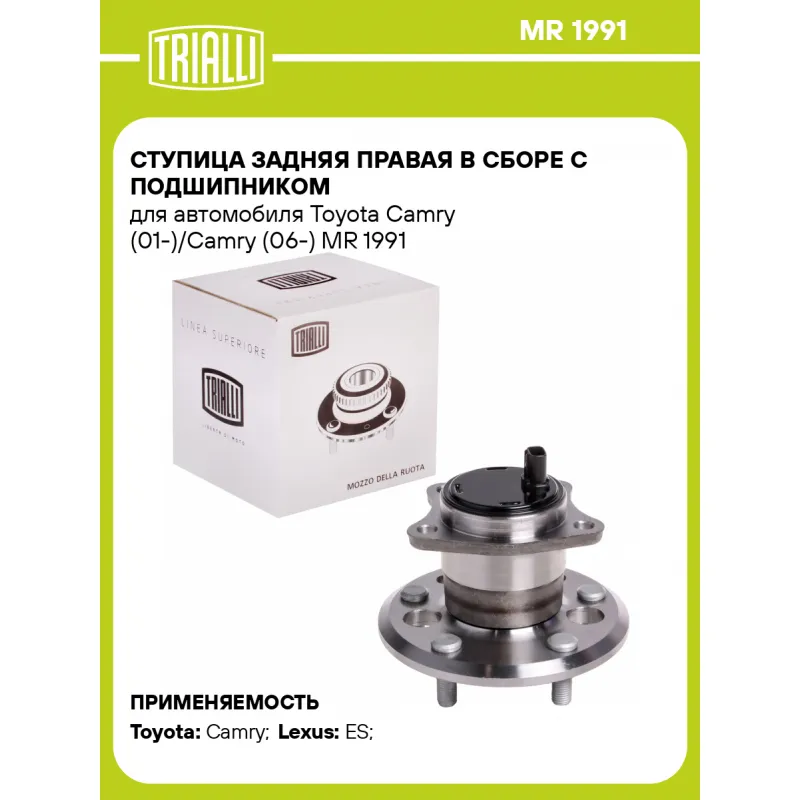 Ступица задняя правая в сборе с подшипником для автомобиля Toyota Camry (01-)/Camry (06-) Характеристики: Артикул: MR 1991 OEM номера: 42450-06040, 42450-06041, 42450-48010, 42450-48011 Товарная линейка: BLACK Парный товар: MR 1990 Количество на автомобиль: 1 Подходящая гайка колесная AIRLINE:: ASCR001, ASCR002, ASCR004, ASCR005, ASCR009 Подходящая шпилька колесная AIRLINE:: ASTD002, ASTD006, ASTD008 Сторона установки: Сзади, справа Высота, мм: 139,2 Внешний диаметр, мм: 152 Особенности конструкции:: С подшипником Количество креп. отверстий: 4 Гарантийный срок: 1 год/30 000 км Крепление колёсного диска: M12x1,5 Разболтовка (PCD):: 5x114,3 Разболтовка (PCD): 5-M12x1.5-114.3 Подходит для авто: Toyota Camry (01-), Camry (06-), Camry (06-), Camry (01-) Lexus ES (01-), ES (06-) Для проверки применяемости отправьте VIN автомобиля через вкладку "Есть вопросы о товаре?" Комплектация: Ступица - 1 шт Гарантия: от 1 года.