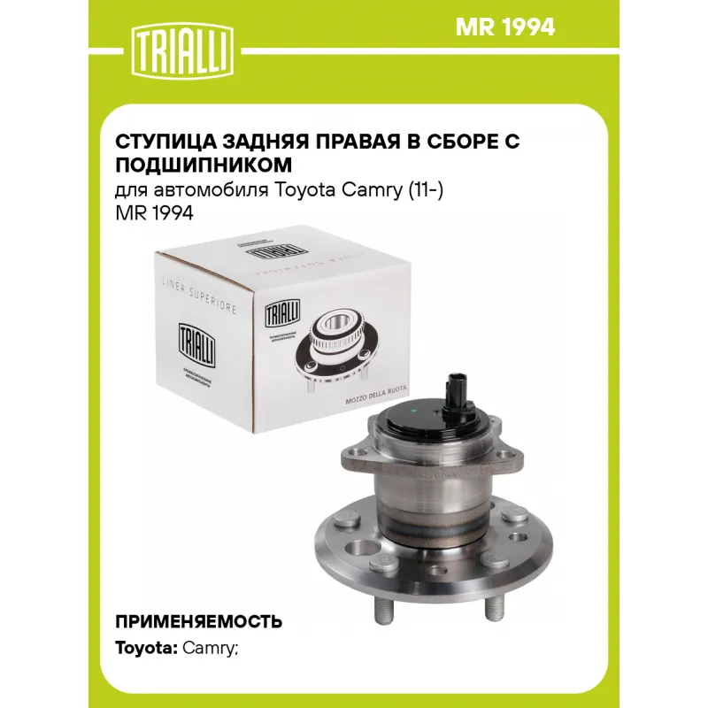 Ступица задняя правая в сборе с подшипником для автомобиля Toyota Camry (11-) Характеристики: Артикул: MR 1994 OEM номера: 42450-06160, 42450-33030, 42450-06110 Товарная линейка: BLACK Парный товар: MR 1993 Количество на автомобиль: 1 Подходящая гайка колесная AIRLINE:: ASCR001, ASCR002, ASCR005 Подходящая шпилька колесная AIRLINE:: ASTD002 Сторона установки: Сзади, справа Высота, мм: 100,7 Внутренний диаметр, мм: 74 Внешний диаметр, мм: 152 Особенности конструкции:: С подшипником Количество креп. отверстий: 4 Гарантийный срок: 1 год/30 000 км Крепление колёсного диска: M12x1,5 Разболтовка (PCD):: 5x114,3 Разболтовка (PCD): 5-M12x1.5-114.3 Подходит для авто: Toyota Camry (11-) Для проверки применяемости отправьте VIN автомобиля через вкладку "Есть вопросы о товаре?" Комплектация: Ступица - 1 шт Гарантия: от 1 года.