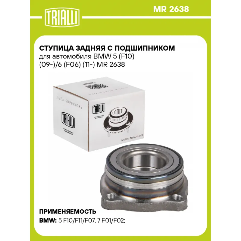 Ступица задняя с подшипником для автомобиля BMW 5 (F10) (09-)/6 (F06) (11-) Характеристики: Артикул: MR 2638 OEM номера: 33406850159, 33 40 6 850 156, 33 40 8 343 733, 33 41 6 775 021 Товарная линейка: BLACK Крепление колёсного диска: M12x1,5 Количество на автомобиль: 2 Сторона установки: сзади, слева/справа Высота, мм: 41 Внутренний диаметр, мм: 49 Внешний диаметр, мм: 94 Особенности конструкции:: С подшипником Количество креп. отверстий: 4 Гарантийный срок: 1 год/30 000 км Подходит для авто: BMW 5 F10/F11/F07 (10-), 5 F10/F11/F07 (10-), 7 F01/F02 (08-) Для проверки применяемости отправьте VIN автомобиля через вкладку "Есть вопросы о товаре?" Комплектация: Ступица - 1 шт Гарантия: от 1 года.