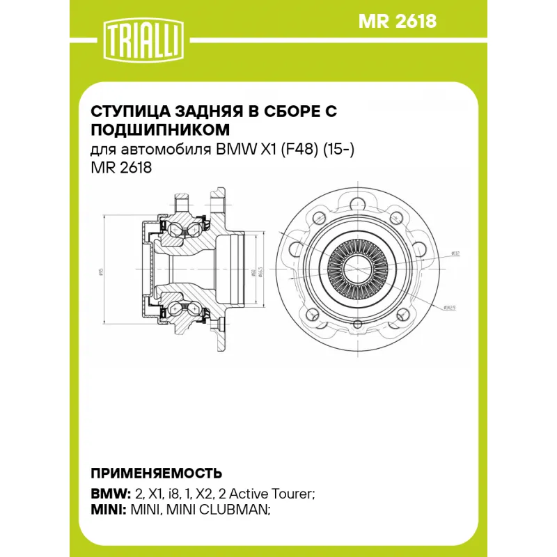 Ступица задняя в сборе с подшипником для автомобиля BMW X1 (F48) (15-) Характеристики: Артикул: MR 2618 OEM номера: 31 20 6 874 443, 31 22 6 850 415, 33 41 6 867 926, 33 41 6 852 157 Количество зубьев: 31 Особенности конструкции:: С подшипником Количество креп. отверстий: 4 Внешний диаметр, мм: 66,5 Гарантийный срок: 1 года/30 000 км ABS сенсор:: 96 Сторона установки: Спереди, слева/справа Разболтовка (PCD):: 5x112 Товарная линейка: BLACK Крепление колёсного диска: M14x1,25 Количество на автомобиль: 2 Подходящий болт колесный AIRLINE:: ABLT006 Комплектация: Ступица - 1 шт Гарантия: от 1 года.