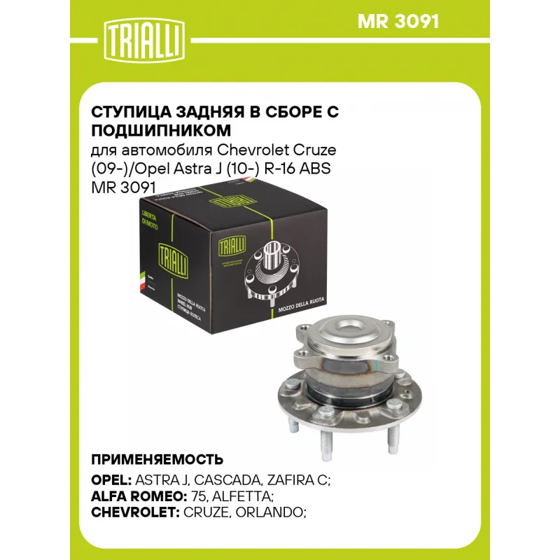 Ступица задняя в сборе с подшипником для автомобиля Chevrolet Cruze (09-)/Opel Astra J (10-) R-16 ABS Характеристики: Артикул: MR 3091 OEM номера: 13577407, 13591999, 328037, 328008 Товарная линейка: BLACK Количество на автомобиль: 2 Подходящая гайка колесная AIRLINE:: ASCR032 Подходящая шпилька колесная AIRLINE:: ASTD009 Сторона установки: Сзади, слева/справа Высота, мм: 120,8 Внешний диаметр, мм: 81,8 Особенности конструкции:: С подшипником Количество креп. отверстий: 4 Гарантийный срок: 1 год/30 000 км Крепление колёсного диска: M12x1,5 Разболтовка (PCD):: 5x115 Разболтовка (PCD): 5-M12x1.5-115 Комплектация: Ступица - 1 шт Гарантия: от 1 года.