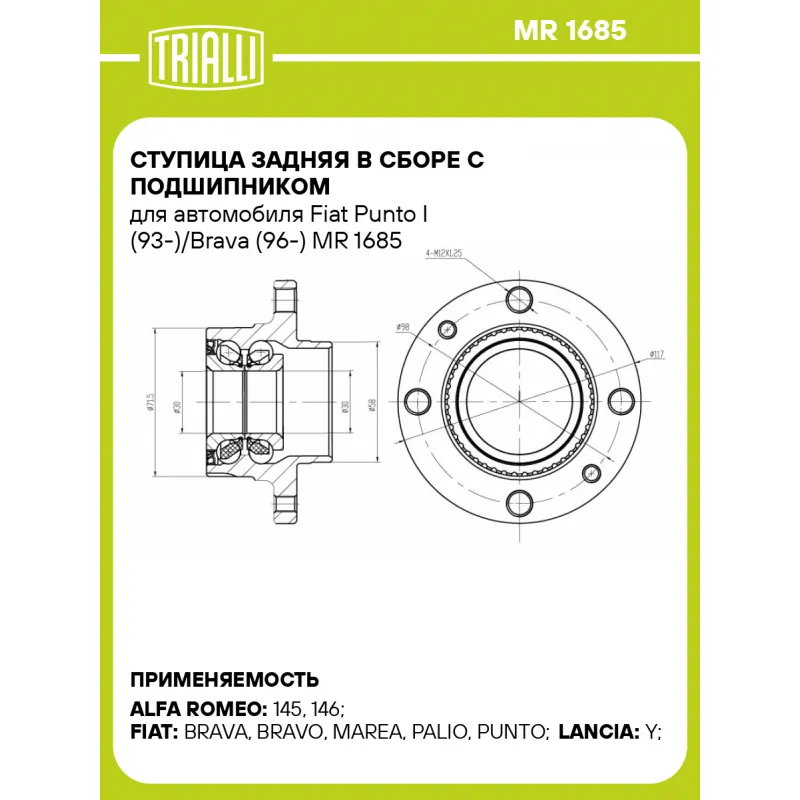Ступица задняя в сборе с подшипником для автомобиля Fiat Punto I (93-)/Brava (96-) Характеристики: Артикул: MR 1685 OEM номера: 60812057, 7769902 Количество зубьев: 44 Особенности конструкции:: С подшипником Внешний диаметр, мм: 58 Гарантийный срок: 1 года/30 000 км ABS сенсор:: Нет Сторона установки: Сзади, слева/справа Разболтовка (PCD):: 4x98 Товарная линейка: BLACK Крепление колёсного диска: M12x1,25 Количество на автомобиль: 2 Подходящий болт колесный AIRLINE:: ABLT024 Комплектация: Ступица - 1 шт Гарантия: от 1 года.