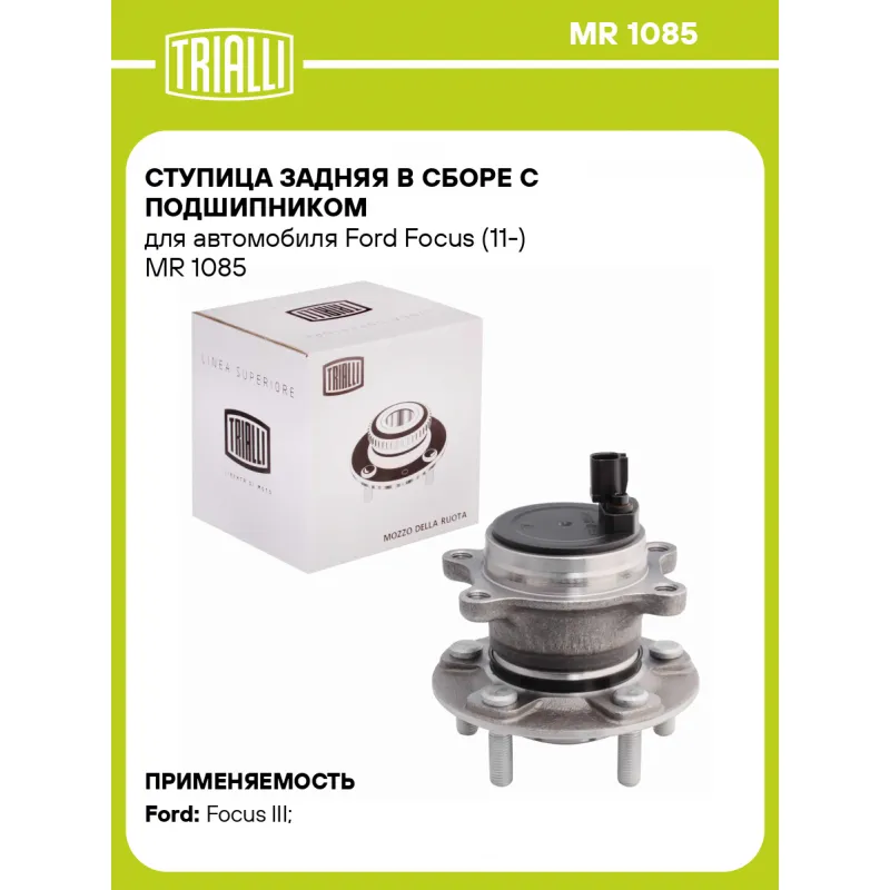 Ступица задняя в сборе с подшипником для автомобиля Ford Focus (11-) Характеристики: Артикул: MR 1085 OEM номера: 1702973, 1703150, 1706172, 1706173, 1760855, 1785690, 1785706, 1814090, 1815483, 1851452, 1863551, 2090834, 2101656, BV61-2C299-AAB, BV61-2C299-AAC, BV61-2C299-AAD, BV61-2C299-AAE, BV61-2C299-AAF, BV61-2C299-AAG, BV61-2C299-AAH, BV61-2C299-BAA, BV61-2C299-BAB, BV61-2C299-BAC, BV61-2C299-BAD, BV61-2C299-BAE, BV61-2C299-BAF Товарная линейка: BLACK Количество на автомобиль: 2 Подходящая гайка колесная AIRLINE:: ASCR006, ASCR007, ASCR031 Сторона установки: Сзади, слева/справа Высота, мм: 101,5 Внутренний диаметр, мм: 81,5 Внешний диаметр, мм: 136 Особенности конструкции:: С подшипником Количество креп. отверстий: 4 Гарантийный срок: 1 год/30 000 км Крепление колёсного диска: M12x1,5 Разболтовка (PCD):: 5x108 Разболтовка (PCD): 5-M12x1.5-108 Подходит для авто: Ford Focus III (11-) Для проверки применяемости отправьте VIN автомобиля через вкладку "Есть вопросы о товаре?" Комплектация: Ступица - 1 шт Гарантия: от 1 года.