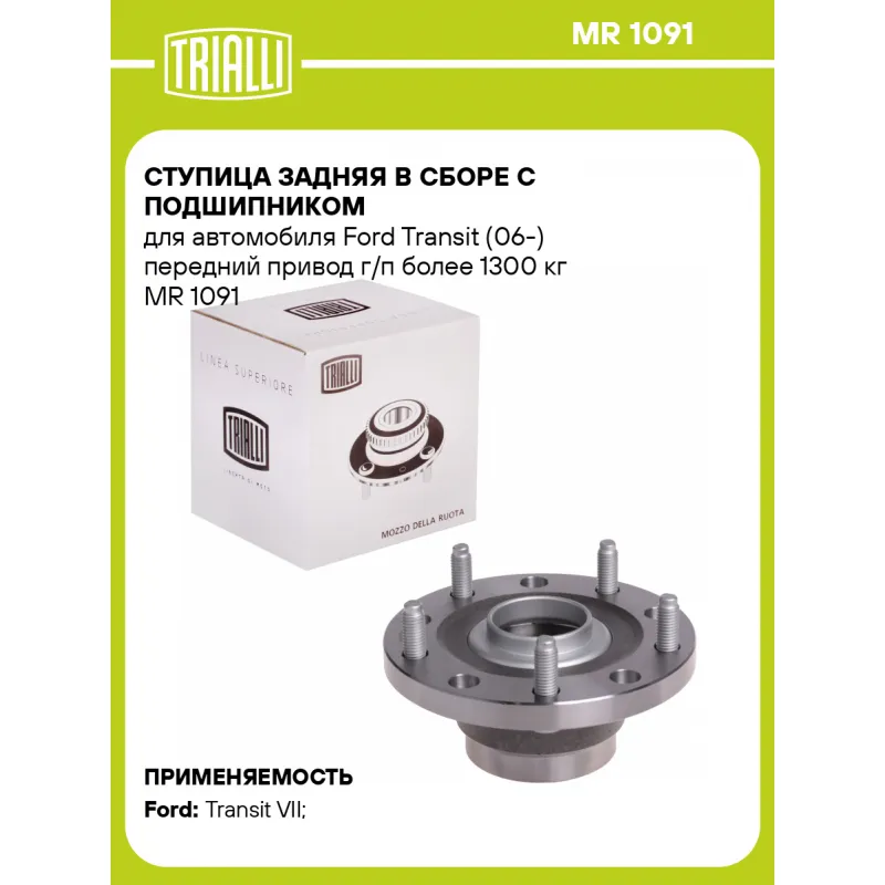 Ступица задняя в сборе с подшипником для автомобиля Ford Transit (06-) передний привод г/п более 1300 кг Характеристики: Артикул: MR 1091 OEM номера: 1 371 313, 1 417 337, 1 377 912, 1 762 407, 6C11-1A049-DA, BK21-2B664-BB, 6C11-2B664-DA, 6C11-2B664-DB Товарная линейка: BLACK Количество на автомобиль: 2 Подходящая гайка колесная AIRLINE:: ASCR029, ASCR035 Подходящая шпилька колесная AIRLINE:: ASTD013, ASTD014 Сторона установки: Сзади, слева/справа Высота, мм: 90,5 Внутренний диаметр, мм: 45 Внешний диаметр, мм: 193 Особенности конструкции:: С подшипником Гарантийный срок: 1 год/30 000 км Крепление колёсного диска: M14x2 Разболтовка (PCD):: 5x160 Разболтовка (PCD): 5-M14-160 Подходит для авто: Ford Transit VII (06-), Transit VII (06-) Для проверки применяемости отправьте VIN автомобиля через вкладку "Есть вопросы о товаре?" Комплектация: Ступица - 1 шт Гарантия: от 1 года.