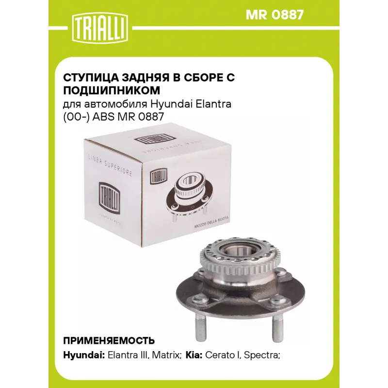 Ступица задняя в сборе с подшипником для автомобиля Hyundai Elantra (00-) ABS Характеристики: Артикул: MR 0887 OEM номера: 527102D115, 527102D315 Товарная линейка: BLACK Количество на автомобиль: 2 Подходящая гайка колесная AIRLINE:: ASCR001, ASCR002, ASCR004, ASCR011, ASCR024, ASCR033 Подходящая шпилька колесная AIRLINE:: ASTD001, ASTD002 Сторона установки: Сзади, слева/справа Высота, мм: 64,5 Внутренний диаметр, мм: 32 Внешний диаметр, мм: 139 Особенности конструкции:: С подшипником Гарантийный срок: 1 год/30 000 км Крепление колёсного диска: M12x1,5 Разболтовка (PCD):: 4x114,3 Разболтовка (PCD): 4 - M12x1.5 - 114.3 Подходит для авто: Hyundai Elantra III (00-), Matrix (01-) Kia Cerato I (04-), Spectra (00-) Для проверки применяемости отправьте VIN автомобиля через вкладку "Есть вопросы о товаре?" Комплектация: Ступица - 1 шт Гарантия: от 1 года.