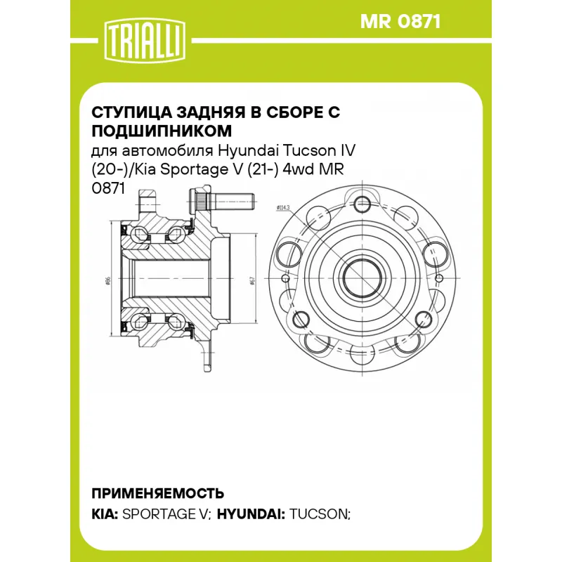 Ступица задняя в сборе с подшипником для автомобиля Hyundai Tucson IV (20-)/Kia Sportage V (21-) 4wd Характеристики: Артикул: MR 0871 OEM номера: 52730-N9000 Количество зубьев: 27 Особенности конструкции:: С подшипником Количество креп. отверстий: 3 Внешний диаметр, мм: 67 Гарантийный срок: 1 года/30 000 км ABS сенсор:: 94 Сторона установки: Сзади, слева/справа Разболтовка (PCD):: 5x114,3 Товарная линейка: BLACK Крепление колёсного диска: M12x1,5 Количество на автомобиль: 2 Подходящая гайка колесная AIRLINE:: ASCR001, ASCR002, ASCR011, ASCR024 Подходящая шпилька колесная AIRLINE:: ASTD001 Комплектация: Ступица - 1 шт Гарантия: от 1 года.