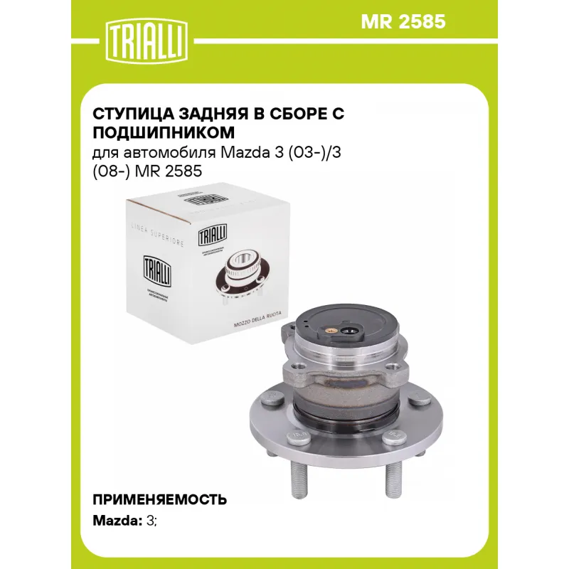 Ступица задняя в сборе с подшипником для автомобиля Mazda 3 (03-)/3 (08-) Характеристики: Артикул: MR 2585 OEM номера: B35N-26-15X, B35N-26-15XA, BBM2-26-15XA, BBM22615XB, BP4K2615XA, BP4K2615XB, BP4K2615XC, BP4K2615XD, BP4K2615XE, BP4K2615XF Товарная линейка: BLACK Количество на автомобиль: 2 Подходящая гайка колесная AIRLINE:: ASCR001, ASCR004, ASCR011 Подходящая шпилька колесная AIRLINE:: ASTD001, ASTD002 Сторона установки: Сзади, слева/справа Высота, мм: 111,5 Внутренний диаметр, мм: 74 Внешний диаметр, мм: 142 Особенности конструкции:: С подшипником Количество креп. отверстий: 4 Гарантийный срок: 1 год/30 000 км Крепление колёсного диска: M12x1,5 Разболтовка (PCD):: 5x114,3 Разболтовка (PCD): 5 - M12x1.5 - 114.3 Подходит для авто: Mazda 3 (03-), 3 (09-), 3 (03-) Для проверки применяемости отправьте VIN автомобиля через вкладку "Есть вопросы о товаре?" Комплектация: Ступица - 1 шт Гарантия: от 1 года.
