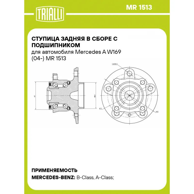 Ступица задняя в сборе с подшипником для автомобиля Mercedes A W169 (04-) Характеристики: Артикул: MR 1513 OEM номера: 169 981 00 27 Особенности конструкции:: С подшипником Количество креп. отверстий: 4 Внешний диаметр, мм: 66.4 Гарантийный срок: 1 года/30 000 км ABS сенсор:: 96 Сторона установки: Сзади, слева/справа Разболтовка (PCD):: 5x112 Товарная линейка: BLACK Крепление колёсного диска: M14x1,5 Количество на автомобиль: 2 Подходящий болт колесный AIRLINE:: ABLT010 Комплектация: Ступица - 1 шт Гарантия: от 1 года.