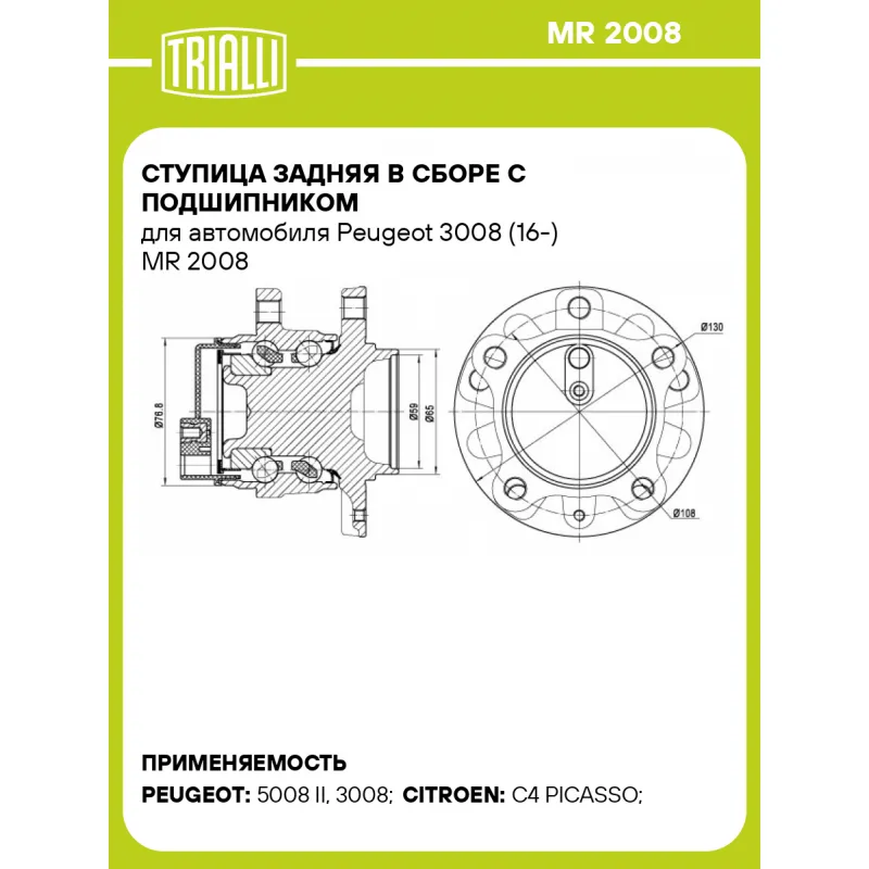 Ступица задняя в сборе с подшипником для автомобиля Peugeot 3008 (16-) Характеристики: Артикул: MR 2008 OEM номера: 9803736180, 98 200 983 80 Особенности конструкции:: С подшипником Количество креп. отверстий: 4 Внешний диаметр, мм: 65 Гарантийный срок: 1 года/30 000 км ABS сенсор:: 96 Сторона установки: Сзади, слева/справа Разболтовка (PCD):: 5x108 Товарная линейка: BLACK Крепление колёсного диска: M12x1,25 Количество на автомобиль: 2 Подходящий болт колесный AIRLINE:: ABLT007 Комплектация: Ступица - 1 шт Гарантия: от 1 года.