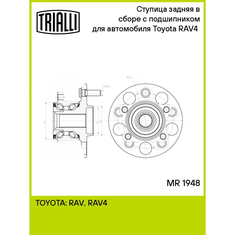 Ступица задняя в сборе с подшипником для автомобиля Toyota RAV4 (18-) Характеристики: Артикул: MR 1948 OEM номера: 4241042060, 424100R030 Количество зубьев: 26 Особенности конструкции:: С подшипником Количество креп. отверстий: 4 Внешний диаметр, мм: 60 Гарантийный срок: 1 года/30 000 км ABS сенсор:: 96 Сторона установки: Сзади, слева/справа Разболтовка (PCD):: 5x114,3 Товарная линейка: BLACK Крепление колёсного диска: M12x1,5 Количество на автомобиль: 2 Подходящая гайка колесная AIRLINE:: ASCR001, ASCR002, ASCR005 Подходящая шпилька колесная AIRLINE:: ASTD002 Комплектация: Ступица - 1 шт Гарантия: от 1 года.