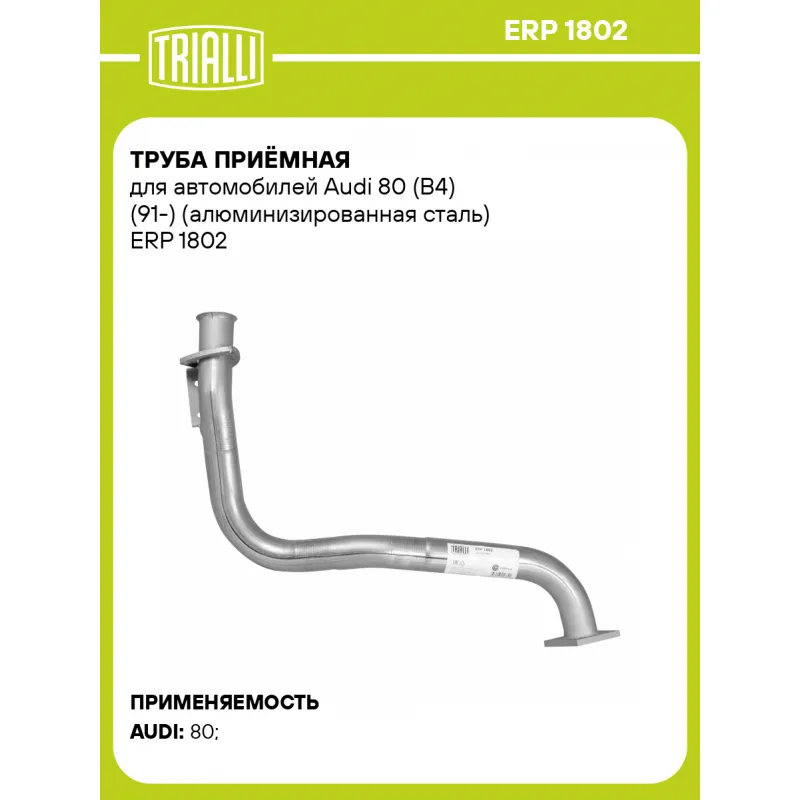 Труба приёмная для автомобилей Audi 80 (B4) (91-) (алюминизированная сталь) Характеристики: Артикул: ERP 1802 OEM номера: 8A0253101B Количество на автомобиль: 1 Гарантийный срок: 2 года/60 тыс. Материал: Алюминизированная сталь Длина изделия (мм): 697 Диаметр трубы (мм): 51 Место установки: спереди Товарная линейка: BLACK Дополнительная информация: Этикетка изделия может отличаться от представленной на фото Комплектация: Труба приемная - 1 шт Гарантия: от 1 года.