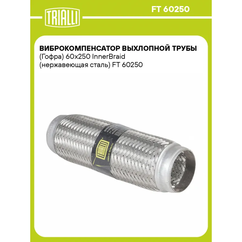 Виброкомпенсатор выхлопной трубы (Гофра) 60x250 InnerBraid (нержавеющая сталь) Характеристики: Артикул: FT 60250 OEM номера: 60250, 60x250 Гарантийный срок: 2 года/60 тыс. Количество на автомобиль: 1 Тип конструкции: InnerBraid Особенности конструкции:: Трёхслойная Размер ID/NL, мм: 60/250 Под трубу диаметром, мм: 59-60,3 Длина изделия (мм): 250 Материал: Нержавеющая сталь марки AISI 201 Товарная линейка: BLACK Дополнительная информация: Этикетка изделия может отличаться от представленной на фото Комплектация: Виброкомпенсатор выхлопной трубы - 1 шт Гарантия: от 1 года.