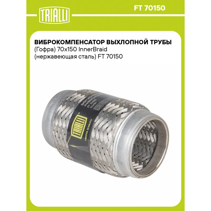 Виброкомпенсатор выхлопной трубы (Гофра) 70x150 InnerBraid (нержавеющая сталь) Характеристики: Артикул: FT 70150 OEM номера: 70-150, 70x150 Гарантийный срок: 2 года/60 тыс. Количество на автомобиль: 1 Тип конструкции: InnerBraid Особенности конструкции:: Трёхслойная Размер ID/NL, мм: 70/150 Под трубу диаметром, мм: 68-70 Длина изделия (мм): 150 Материал: Нержавеющая сталь марки AISI 201 Товарная линейка: BLACK Дополнительная информация: Этикетка изделия может отличаться от представленной на фото Комплектация: Виброкомпенсатор выхлопной трубы - 1 шт Гарантия: от 1 года.