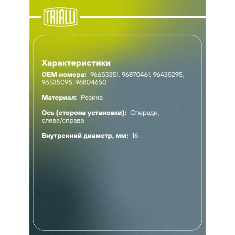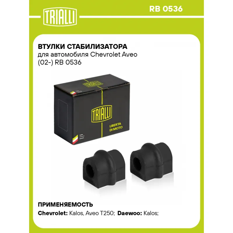 Втулки стабилизатора для автомобиля Chevrolet Aveo (02-) Характеристики: Артикул: RB 0536 OEM номера: 96653351, 96870461, 96435295, 96535095, 96804650 Гарантийный срок: 1 года/30 000 км Товарная линейка: BLACK Количество на автомобиль: 1 Ось (сторона установки): Спереди, слева/справа Материал: Резина Внутренний диаметр, мм: 16 Количество деталей в артикуле, шт.: 2 Подходит для авто: Chevrolet Kalos (05-), Aveo T250 (06-), Aveo T255 (08-), Aveo T200 (02-) Daewoo Kalos (02-) Для проверки применяемости отправьте VIN автомобиля через вкладку "Есть вопросы о товаре?" Комплектация: Втулка стабилизатора - 2 шт Гарантия: от 1 года.