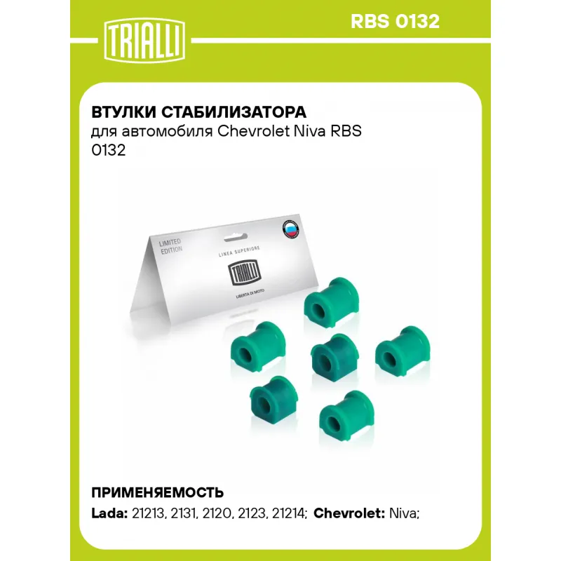 Втулки стабилизатора для автомобиля Chevrolet Niva Характеристики: Артикул: RBS 0132 OEM номера: 2123-2906040, 2123-2906046, 21230-2906040-00, 21230-2906046-00 Товарная линейка: PRO Количество на автомобиль: 1 Ось (сторона установки): Спереди, слева/справа Материал: Полиуретан Внутренний диаметр, мм: 21 Гарантийный срок: 1 года/30 000 км Дополнительная информация: Цвет изделия может отличаться от представленного на фото Количество деталей в артикуле, шт.: 6 Подходит для авто: ВАЗ 21213, 2131, 21213, 2131, 2120, 2123, 21214 Chevrolet Niva (02-) Для проверки применяемости отправьте VIN автомобиля через вкладку "Есть вопросы о товаре?" Комплектация: Втулка полиуретановая - 6 шт Гарантия: от 1 года.