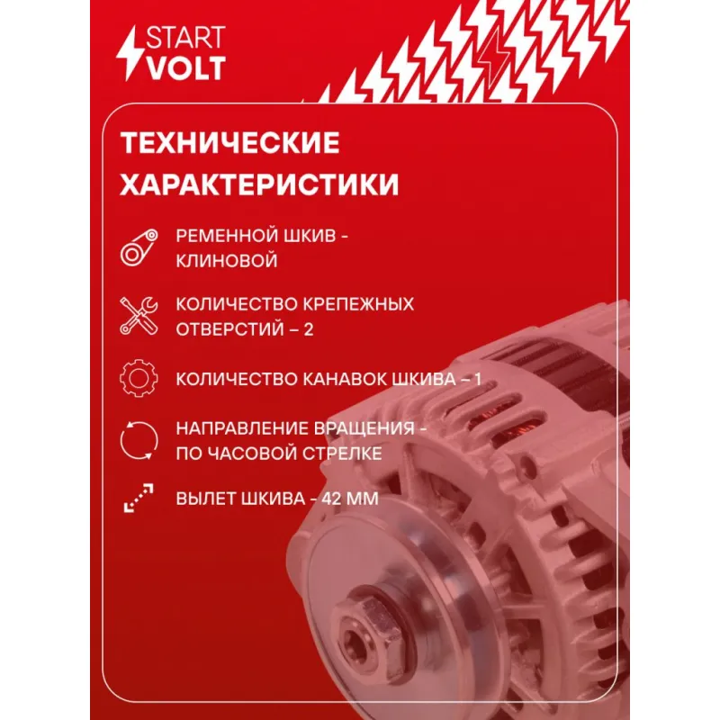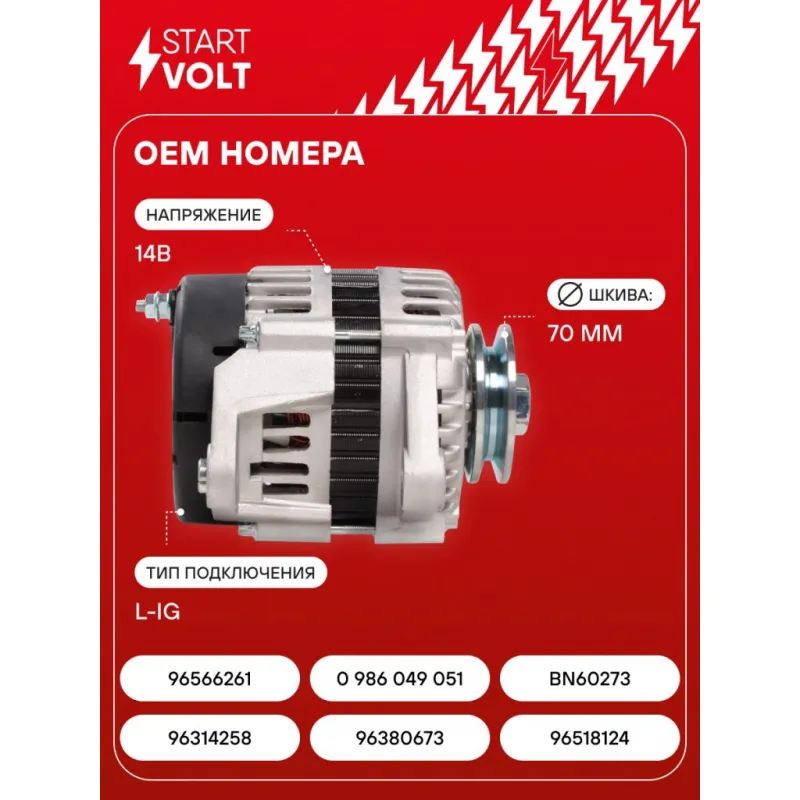 Генератор для автомобилей Daewoo Matiz (01-)/Chevrolet Spark (05-) 0.8i/1.0i (клиновой шкив, тип Mando) 65A Описание: Оригинальный генератор STARTVOLT LG 0551 рассчитан на ток 65 А и напряжение 14 В. Изготовлен аналогично оригинальной конструкции тип Mando. с ремённым шкивом шкив (диаметр 70 мм) полностью совместим с оригинальными агрегатами. Подходит для автомобилей: CHEVROLET SPARK, MATIZ, CHEVROLET (SGMW) SPARK, DAEWOO MATIZ, UZ-DAEWOO MATIZ.. Если у вас есть вопросы по применяемости, мы всегда готовы помочь вам с подбором по VIN-НОМЕРУ ВАШЕГО АВТОМОБИЛЯ. Преимущества: - Полностью соответствует оригинальным узлам; - Высокоточная сборка с пооперационным контролем качества; - Каждый генератор проходит стендовое тестирование — протокол в комплекте; - Надёжность в любых условиях эксплуатации; - STARTVOLT 15 лет на рынке автоэлектрики — нам доверяют профессионалы; - Гарантия 2 года; - Сертифицирован по стандарту EAC (ЕАЭС) — соответствует требованиям безопасности и качества; Автомобильный генератор в сборе — готов к установке. Отличный выбор для надежной замены штатного генератора. Характеристики: Артикул: LG 0551 OEM номера: 96314258, 96380673, 96518124, 96566261, 0 986 049 051, BN60273 Напряжение, В: 14 Выходной ток, А: 65 Тип подключения: L-IG Диаметр шкива, мм: 70 Ременной шкив: с ремённым шкивом Количество крепежных отверстий: 2 Количество канавок шкива: 1 Направление вращения: По часовой стрелке Вылет шкива, мм: 42 Сопутствующий товар: Регуляторы напряжения генераторов: VRR 0551 Сопутствующий товар: Мосты диодные генераторов: VDB 0551 Подходит для авто: Chevrolet Spark (05-) Daewoo Matiz (98-) Для проверки применяемости отправьте VIN автомобиля через вкладку "Есть вопросы о товаре?" Комплектация: Генератор - 1 шт Паспорт изделия/гарантийный талон - 1 шт Индивидуальный технический паспорт изделия (с фирменным ID) - 1 шт Гарантия: от 1 года.